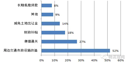 问卷调查结果显示,物流园区吸引企业入驻的优惠条件最主要的是周边交通市政设施改造,其次依次是便捷通关、财政补贴和减免土地出让金。如图24所示。这表明政府政策措施对物流园区发展的影响增大。