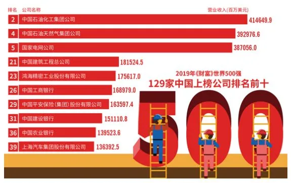 129家中国企业中,国有企业上榜总数为88家,由国务院国资委出资企业共有48家。其中,中国石化、中国石油、国家电网分列2019世界500强榜单的第二位、第四位、第五位。