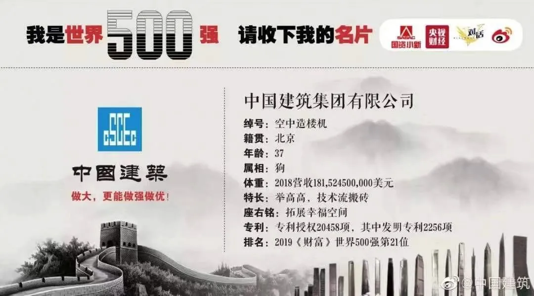 比如绰号空中造楼机的中国建筑,2019世界500强排名第21位,特长是“举高高,技术流搬砖”,座右铭是拓展幸福空间。