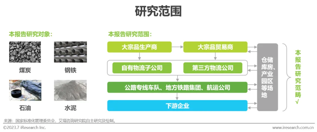 指根据大宗商品相关业务的实际需要,将运输、储存、装卸、搬运、包装、流通加工、配送、信息处理等基本功能实施有机结合,使大宗商品从供应地向需求地进行实体流动的过程。本报告中,大宗物流讨论范围仅包含大宗品在中国境内物流活动产生的费用,不包含进口大宗品到港前及出口大宗品出港后物流活动产生的费用。