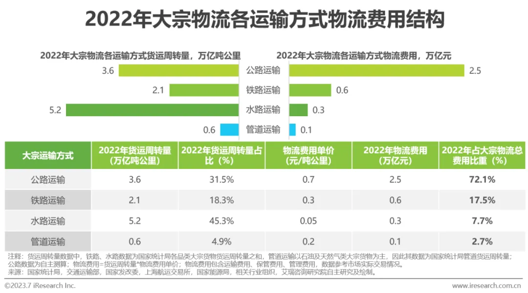 按运输方式分类,大宗物流费用可拆分为公路运输物流费用、铁路运输物流费用、水路运输物流费用及管道运输物流费用。其中,公路运输主要应用于短途干线运输及中长途两端工厂与场站间的短倒运输,铁路、水路运输主要应用于中长途干线运输,管道运输主要应用于石油及天然气类货物。其中,水路运输运距高于其余运输方式,货运周转量占比位于首位;公路运输的物流费用单价高于其余运输方式,用31.5%的货运周转量创造了72.1%的物流费用。