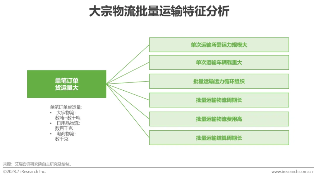 大宗物流采用批量运输形式,即托运人与承运人围绕批量货物而非单一批次货物签订协议。大宗品为第二产业生产活动的生产物资,因此大宗物流货运规模大,2022年大宗品货运量基数约120亿吨。在此背景下,大宗品物流订单具有以下特征:1)单笔订单货运量大,多为数十吨;2)物流周期较长,由托运人分批次下达具体运输需求并开展实际物流活动,需要有效组织大量运力进行循环运输;3)多采用月度或季度统一结算物流费用,结算周期长,对于行业参与主体的融资能力要求较高;4)物流组织方式较为粗放,对包装、分拣等物流活动进行部分简化。