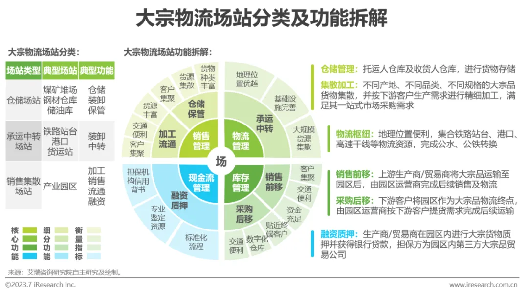 大宗物流除运输外的物流功能都在场站内完成,如仓储、保管、装卸、加工、中转等。大宗物流过程中运输停顿的节点较多,按场站内发生的物流活动,可将大宗物流场站划分为仓储场站、承运中转场站、销售集散场站三类。综合来看,可将场站在物流链路中的功能拆解为销售管理、物流管理、库存管理、现金流管理四类,各场站综合其所在区域产业集聚情况、物流基础设施分布、配套服务资源丰富度等区位条件,承担一种或多种功能。其中,产业园区同时设有物流中心、配送中心、运输组织管理中心、物流信息中心等团队,作为多功能聚集体在大宗物流链条中发挥枢纽型作用。