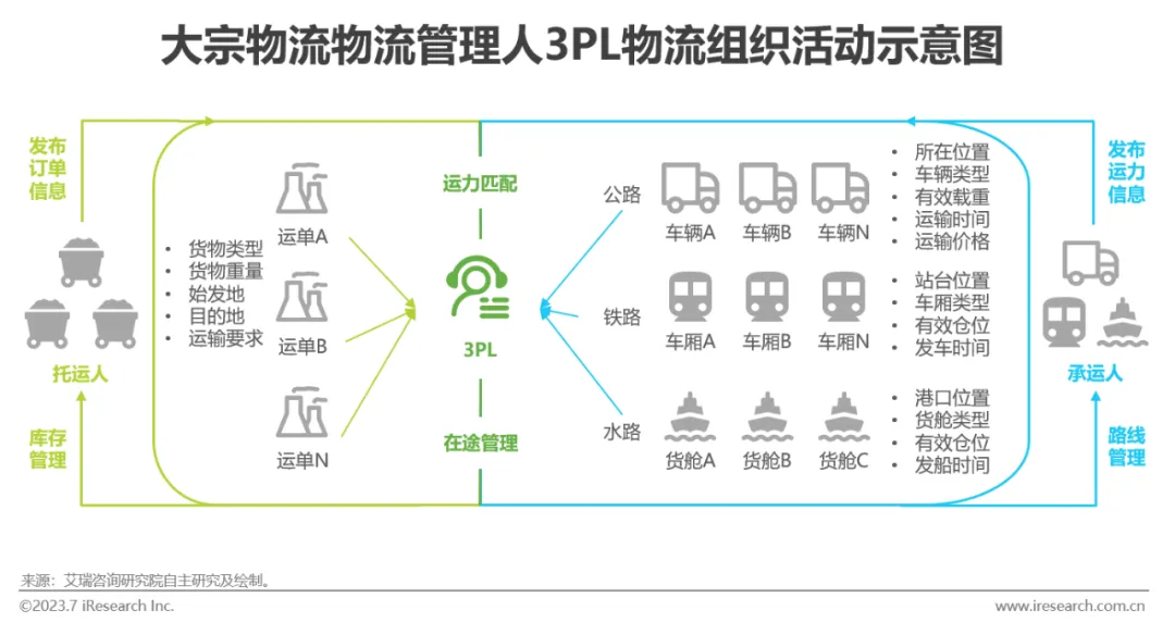 大宗物流物流管理人中,3PL通过运力、场站等多种物流资源整合、组织及管理,为托运人提供稳定、低价、专业、优质、下游客户满意的第三方物流服务。大宗物流各环节运力资源信息及交易信息不透明,实际运输流程及交付的标准化程度较低,因此,稳定、丰富且灵活的运力资源为3PL的核心竞争力之一。3PL的运力资源来自长期合作且响应迅速的私域运力池,及通过其他物流管理人触及的公域运力池。其中,私域运力池主要通过线下货运站、电话、网络货运平台等方式沉淀。物流资源信息中枢的角色使得3PL承担物流成本核算及运价设定的职能,链接上下游企业完成物流费用的支付结算。