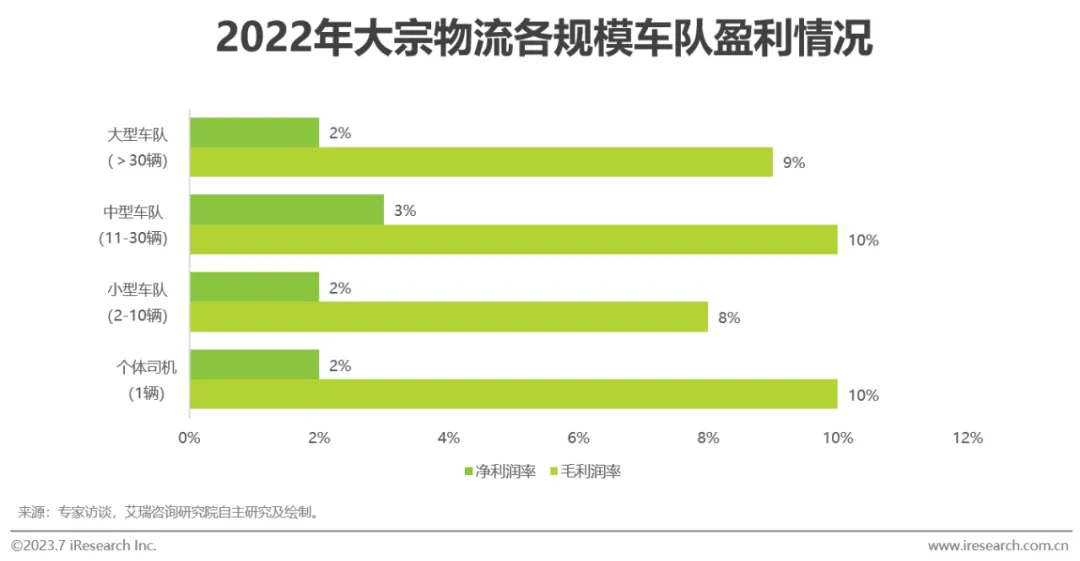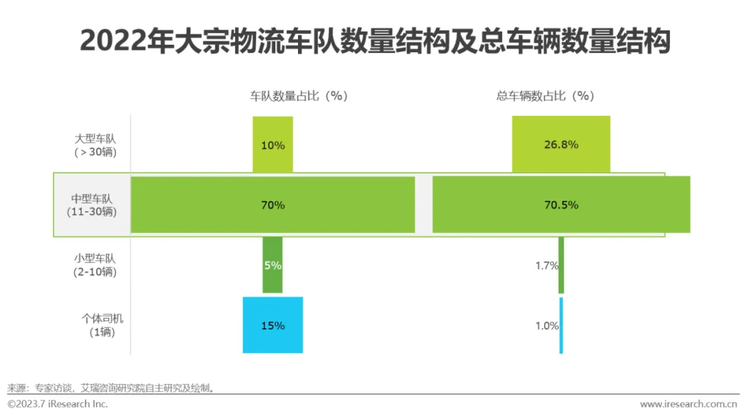 大宗物流车队市场高度分散且出现规模断层。大宗物流头部车队以大宗品生产商的物流子公司为主,车辆多为上百辆;中型车队规模集中于11-30辆车,为市场中坚力量,占比高达70%,其主要原因为:1)由于批量运输特征,大宗物流账期长,对于车队的资金垫付能力要求高;2)大宗物流托运人的价格敏感度高,车队在物流链条中话语权低且价格竞争激烈,使得大宗物流单车产值低,较小的车队规模有利于精细管理以保障车队盈利;3)大宗物流运输需求依赖于车队与区域内大宗品生产商等客户的良好且长期维护的公共关系,因此客户群体与业务规模相对稳定,扩大车队规模会导致新增运输费用收入难以覆盖新增车辆固定资本投入,同时,这将导致个体司机获取稳定运单的难度较大,数量占比低于全行业情况。