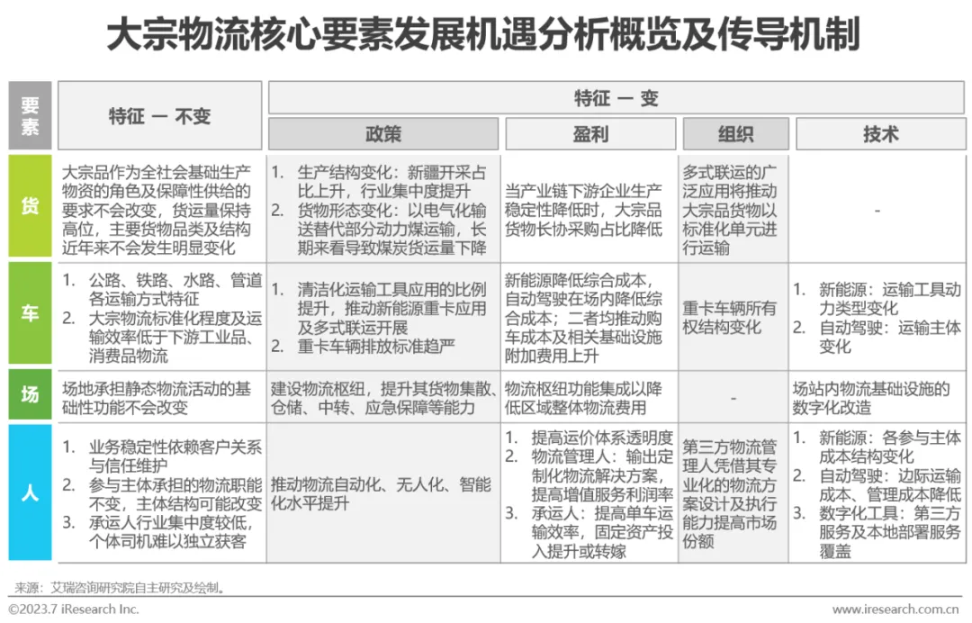 “政策、盈利、组织、技术”四方面力量通过推动“货、车、场、人”四要素的变化方向与变化程度为大宗物流全行业带来变化。