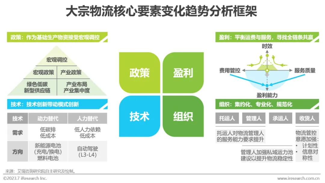 • 其中,“政策”为大宗生产资料宏观规划与调控,“盈利”为各参与主体的经营目标,“组织”为物流资源组织模式,“技术”为新能源、自动驾驶及数字化手段。