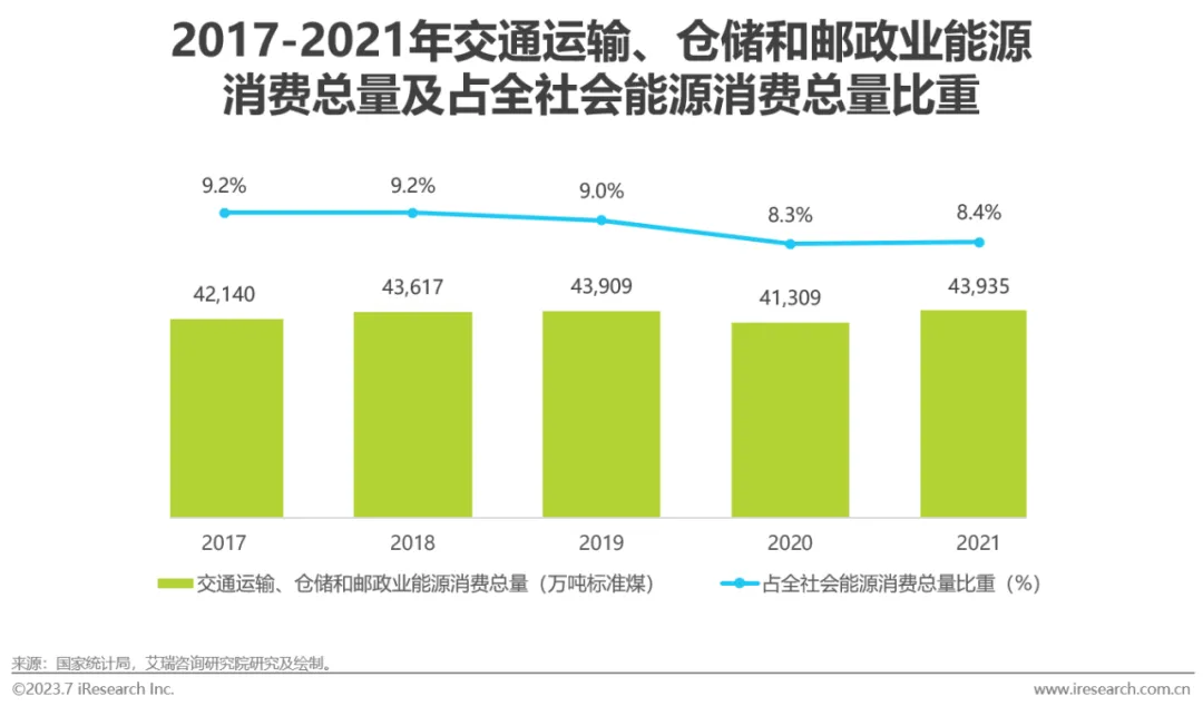 在我国2030年前实现碳达峰的目标之下,交通运输作为主要碳排放领域之一,面临较大减碳压力。近年来,我国出台多项绿色交通相关政策,主要工作集中在基础设施清洁化改造、大幅应用清洁低碳的运输方式与运输工具、提高运输组织效率等。受疫情期间民用航空旅客周转量下降等因素影响,2021年交通运输行业能源消费总量占全社会比重为8.4%,伴随清洁化交通工具的使用比例提升,预计2025年将维持在8%附近。