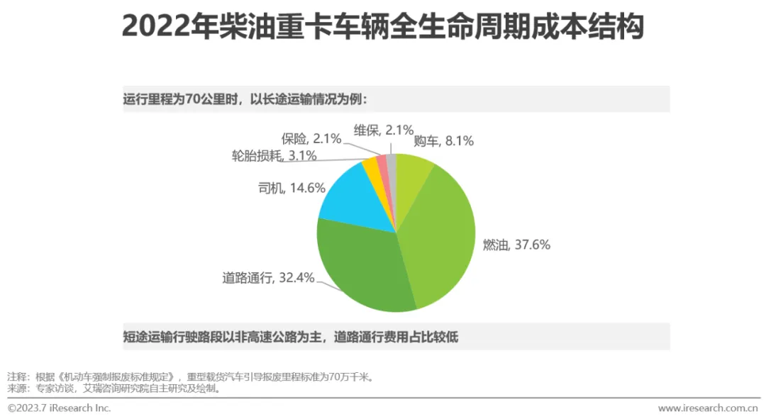 大宗车队难以通过规模效应提高利润率。相较于快递快运车队,大宗车队的单车产值更低,因此其利润率主要取决于单车使用效率,大宗车队通过提高运输效率、提高车辆运输频次、提高车辆出勤率等方式实现单车使用效率最大化,以提升边际收益,获得更高利润。当车队规模扩大时,其业务规模难以同步增长并支撑其单车使用效率维持较高水平。因此,管理水平较高的中型车队(11-30辆车)净利润率处于行业领先水平。车辆成本为车队成本的主要构成部分,相对固定且难以通过运营手段改善。在干线运输中,燃油成本在全生命周期成本中占比最高,为37.6%,其次为道路通行成本,占比为32.4%;短倒运输与场内运输不涉及道路通行成本。