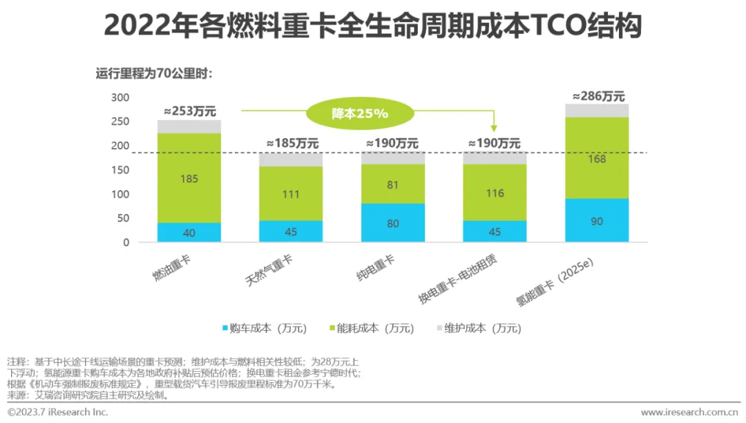 在低碳政策推动下,新能源车辆应用范围不断扩大。目前,纯电重卡与氢能重卡是新能源重卡的两大主流类型,未来在大宗物流领域内的应用情况需配合基础设施建设情况与实际单车经济效益展开讨论。目前纯电重卡销量高于氢能重卡,受限于动力电池能量密度较低,其续航较短,适用于运距200km以内、路线固定、物流需求密集的短倒运输场景;换电重卡适用于干线运输。从经济效益角度出发,纯电重卡与换电重卡通过降低能耗成本能够降低约25%车辆全生命周期成本;值得注意的是,较低的能量密度或将导致车辆日均有效行驶里程下降,进而导致车辆高性能年限内(多为0-2年)总产能下降。