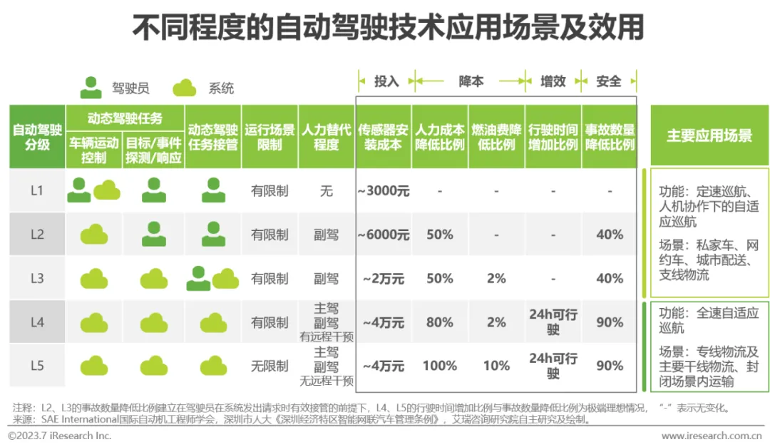 在司机老龄化背景下,自动驾驶车辆的应用不仅能够降低司机驾驶强度,也能够为车队节约一定比例的司机工资成本与管理成本,并有望实现全天24小时驾驶。自动驾驶对于公路智慧化基础设施覆盖程度要求较高,如低延时的全覆盖无线通讯网络等,企业园区及具有密集且稳定物流需求的主要干线道路或将率先进行智慧化升级。以封闭园区L4级别自动驾驶为例,预计实现车辆采购成本增加10%,燃油成本下降2%,司机成本下降50%,单车产能提升50%。