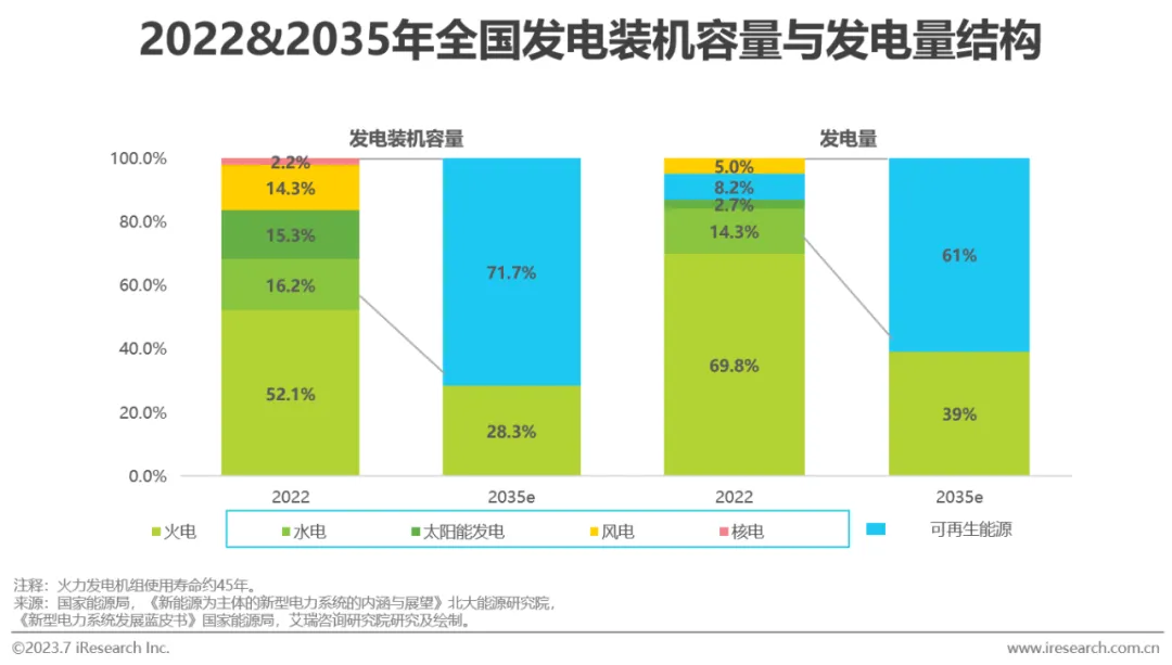 实施能源绿色低碳转型是实现碳达峰、碳中和的关键举措,国家推出多项政策鼓励非化石能源发电基础设施投资及消费。根据《“十四五”现代能源体系规划》数据,可再生能源占能源消费总量比重有望由2022年的17.5%提升至2030年的25%。伴随我国新型电力系统的持续建设,终端部门电气化程度逐渐提升,电力系统能源结构将趋近于社会整体能源结构。从我国电力生产结构来看,2022年火力发电占比接近70%,至2035年有望下降至39%。火力发电占比下降对煤炭供需结构的影响不仅体现在货运量下降与运距缩短,伴随能源供应企业的发电结构由单一的煤炭能源供给向多种能源供给转变,煤炭的作用逐渐由主体发电产能向弹性发电产能转变,由能源供应企业与地方政府共同调控。受限于能源转型进程与火力发电机组基础设施的碳锁定效应,现阶段仍将继续发挥煤炭的“压舱石”作用和煤电的基础性调节性作用。