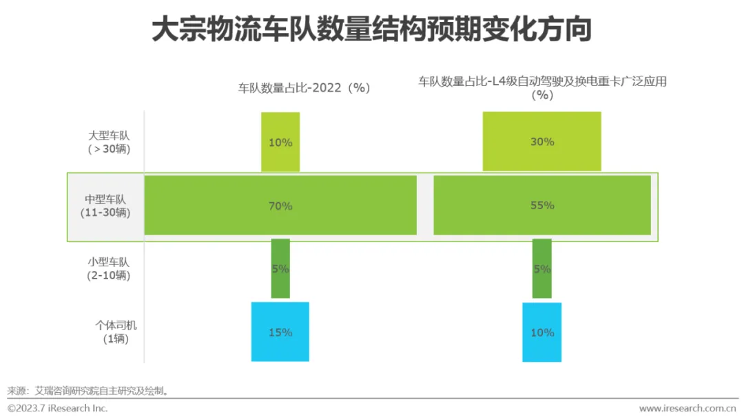 新能源与自动驾驶技术的广泛应用将推动重卡车辆的购车成本上升与日常运营成本下降。从采购主体来看,个体司机采购车辆的前期投入成本较高,大型车队与资产管理机构资金优势较强,且有望通过规模性采购降低换电站、自动驾驶系统等基础设施的边际成本。从运营主体来看,L4级自动驾驶车辆管理难度较低,中型车队扩张难度较低,同时,产业园区的集聚效应与物流服务专业度提升有望降低中型车队扩张的货源压力;大型车队价格优势与服务优势显著提升,进而导致小微承运人生存空间受到挤压。
