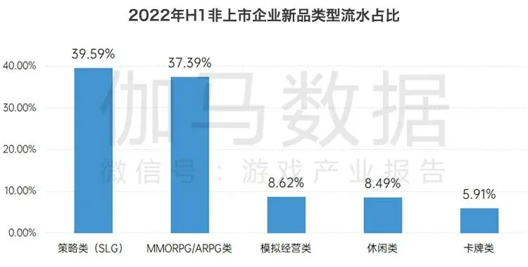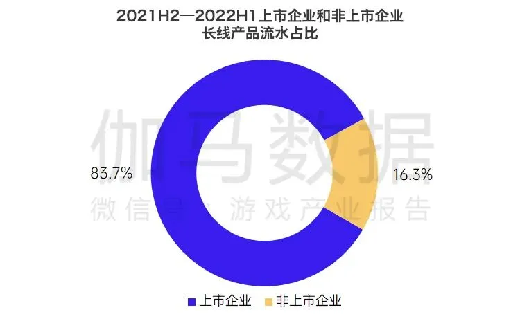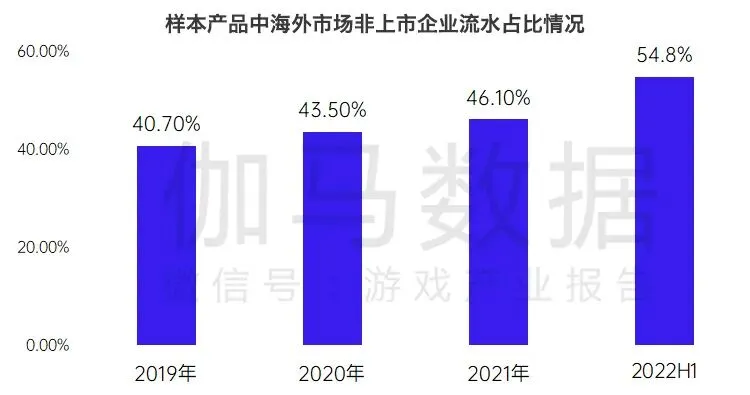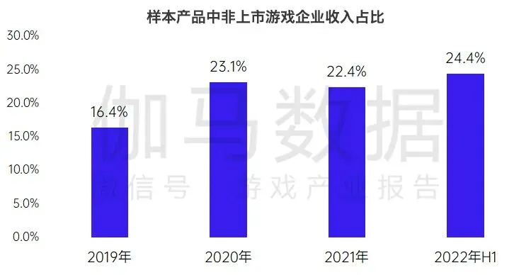 根据伽马数据估算,2022年上半年样本产品中,非上市游戏企业产品收入在样本产品全部收入中的占比达到24.4%,为近四年来新高。非上市游戏企业产品流水占比升高,说明非上市游戏企业的竞争力有所提高。