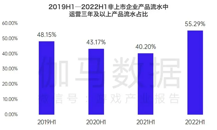 在非上市企业的产品流水中,运营时间为三年及以上产品的流水占比达到55.29%,为近四年上半年来最高水平。