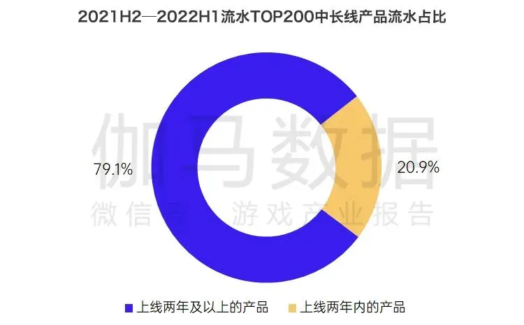 根据伽马数据监测,2021年7月—2022年6月期间一年时间内流水TOP200产品中,运营时间在两年及以上的产品流水占比达到79.1%,长线产品在市场竞争中的重要性凸显。