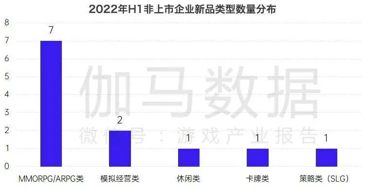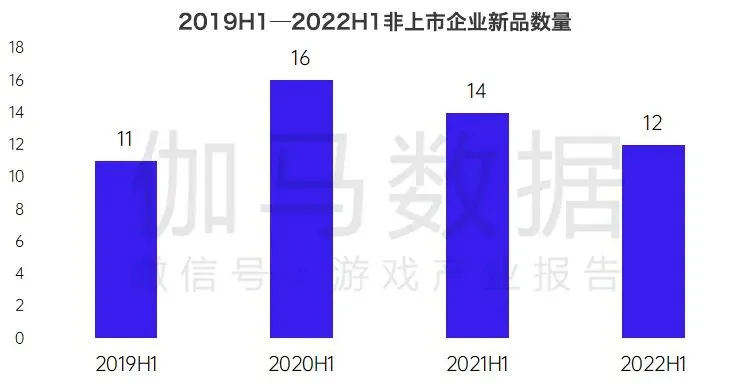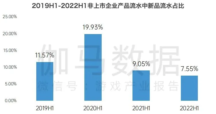 2022年上半年,非上市游戏企业新品数量为12款,非上市游戏企业产品流水中新品占比为7.55%,相较2021年均出现下滑。新品表现不佳、缺乏爆款新品是非上市游戏企业面临的问题。