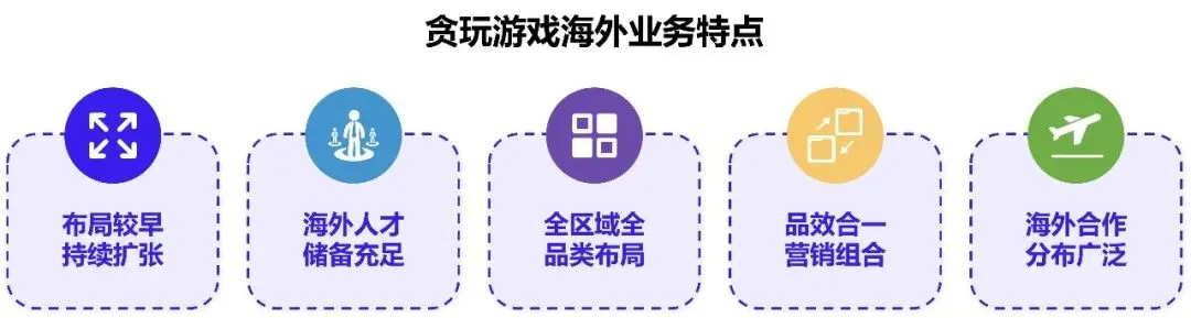 贪玩游戏在国内产品发行领域取得优势的同时,也进一步打造海外发行能力。贪玩游戏在海外发行方面具有以下特点:1.依托国内发行优势,在产品供应商及媒体关系上提前布局相关资源,于2021年正式启动,预计到2024年贪玩游戏海外事业部团队规模将超200人。2. 海外多品类产品线布局,推进多赛道突破。放置卡牌以及卡牌融合产品是海外事业部的重点赛道之一,未来规划每年保证5款全球化卡牌产品;联合优秀研发力量共同定制适合海外用户的多题材经营养成游戏,打造出更贴合海外用户的题材游戏;SLG赛道是另一队主力军,已在帝国题材以及美国西部本地化题材的试探和经验积累,联合明星研发团队共同研制高水准的SLG游戏,为长线稳定收益做规划;针对韩国港澳台用户属性结合贪玩旗下的研发资源,将会在MMORPG赛道深耕。3. 紧抓元宇宙发展机遇,助力游戏产品的开发和海外业务扩展,贪玩游戏协同中国香港、中国台湾、美国、加拿大等全球多地发行公司,联合打造现象级产品Party Icons,以趣味社交为本质体验,高定潮玩的流行元素为外显,升级打造成现实与元宇宙互联的IP化全球式社区产品。