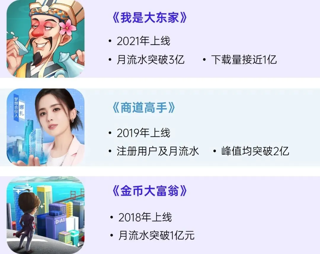 益世界的模拟经商类产品有《我是大东家》《商道高手》《金币大富翁》等,多款产品均实现月流水破亿,其中《我是大东家》及《商道高手》更是分别取得了月流水破3亿和破2亿的成绩,使得益世界获得了模拟经营类游戏的头部位置。