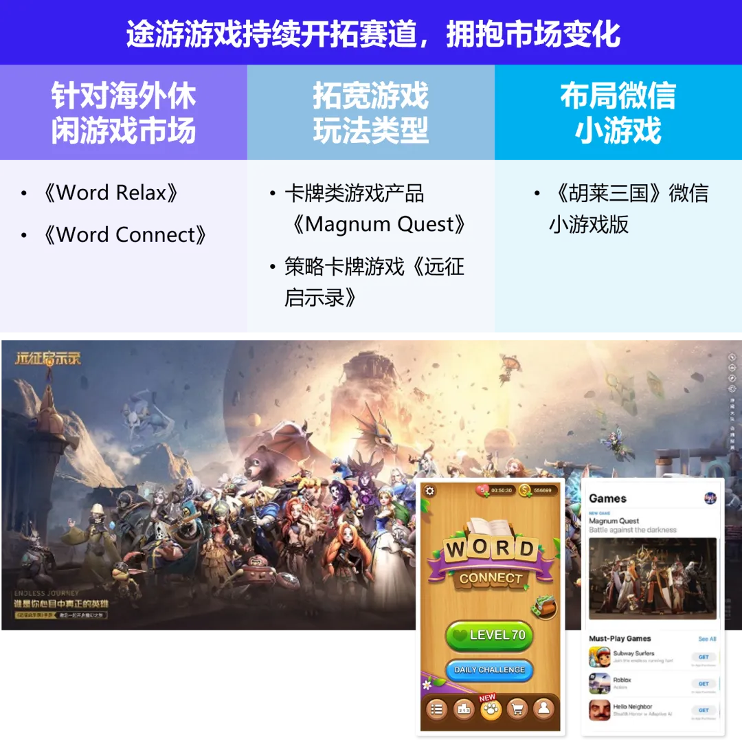 途游游戏在保持休闲品类优势的同时,一直在积极开拓企业新赛道,具体比如开拓海外市场、研发新品类游戏产品、布局小游戏等。从开拓海外市场的角度观察,途游游戏依托长期研发休闲类游戏的优势,在海外市场推出《Word Relax》《Word Connect》等产品,发力海外休闲游戏市场;从研发新品类产品的角度,途游游戏拓宽游戏玩法类型,策略卡牌游戏《远征启示录》于2022年6月正式上线,卡牌类游戏产品《Magnum Quest》在海外上线;从布局微信小游戏的角度,途游游戏在2019年就推出了《胡莱三国》的微信小游戏版。