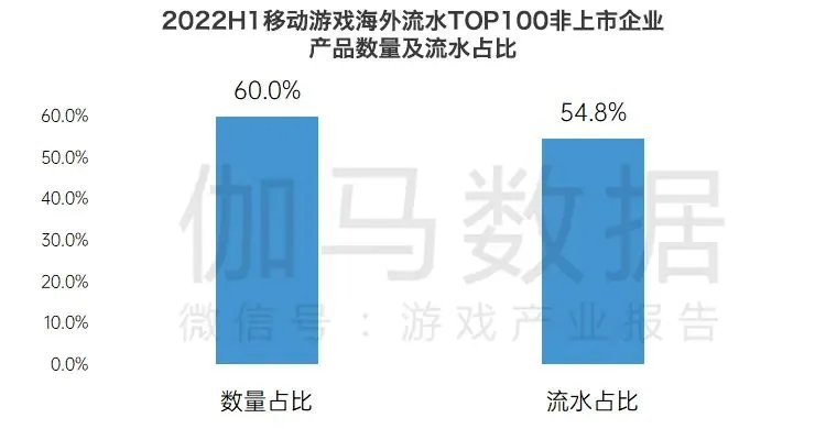 2022年上半年,非上市游戏企业产品在海外流水TOP100游戏产品中的数量占比达到60%,流水占比达到54.8%。非上市游戏企业在产品数量和产品流水两方面均超过上市游戏企业,对于 “游戏出海” “文化出海”具有积极意义。