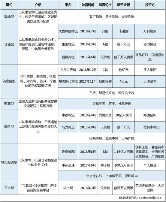 而供应链型是指从采购端到终端提供低温运输、加工、仓储、配送等业务,即将供应商、制造商、物流商、分销商连成一个整体的网络结构。也是近几年刚刚兴起的模式,代表企业有武汉良中行、鲜易供应链、宇培供应链、九曳供应链、郑明现代物流等。其中成立于2014年的九曳供应链在今年10月份获得了正大集团数亿元的C轮融资。