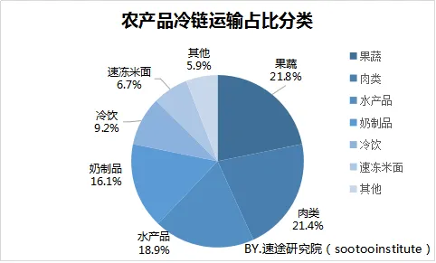 据调查显示,冷链运输中农副产品占比高达60%左右,药品流通占比30%左右。而农产品冷链运输中,果蔬、肉类、水产品等也占据了相当大的比重。