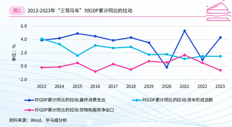 从“三驾马车” (即最终消费支出、资本形成总额、货物和服务净出口)来看,消费成为2023年经济增长的强大推动力。最终消费支出拉动经济增长4.3%,对经济增长的贡献率达82.5%。