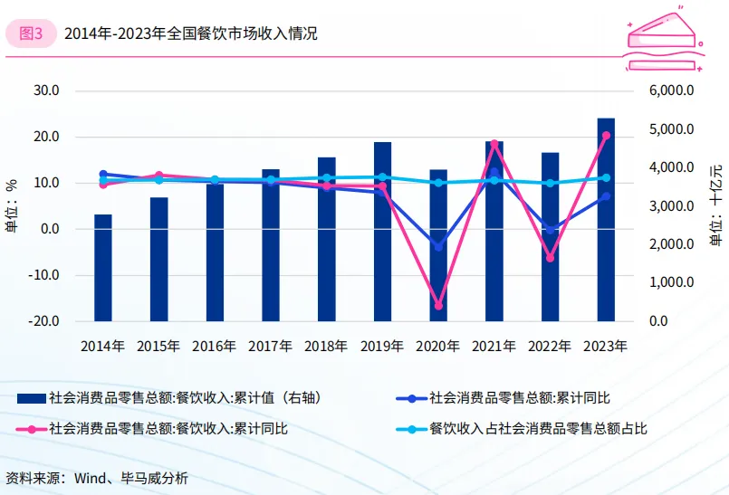 2014年至2023年期间,我国餐饮业年复合增长率达7.3%,展现出其强大的发展动力。特别是在2019年新冠疫情发生后,餐饮业遭受了重大冲击,但行业依然展现出顽强的生命力。