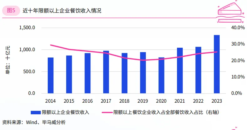 限额以上餐企在全部餐饮收入中的占比从2019年的20.2%上升至25.3%,超过疫情前水平,成为了稳定和推动整个餐饮消费市场的重要基石。