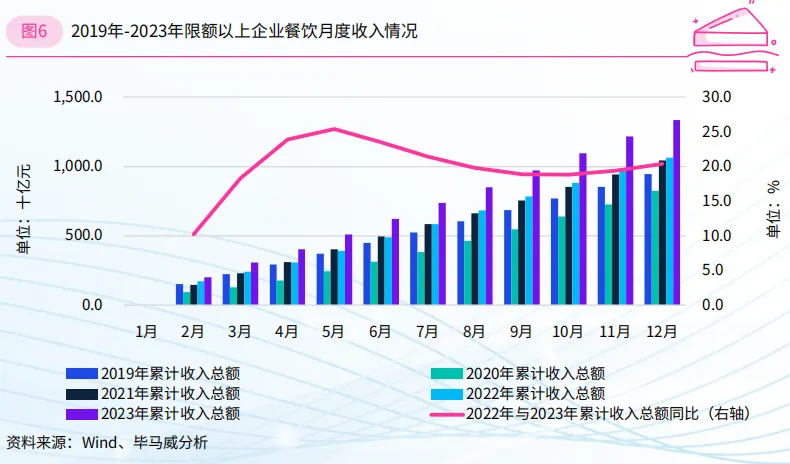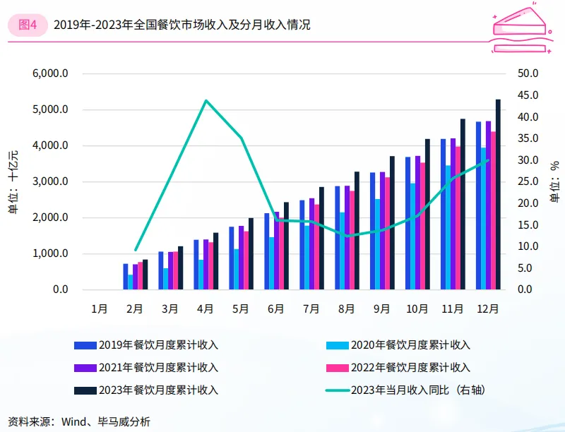 12月,餐饮收入增势喜人,同比上涨30%,累计收入接近5.3万亿元,圆满实现预期目标。