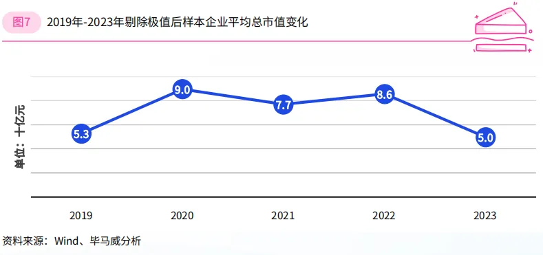 以样本企业5年期间的平均总市值作为对比,剔除极值后,2023年样本企业的平均总市值较2022年下降四成,与疫情前的2019年接近。