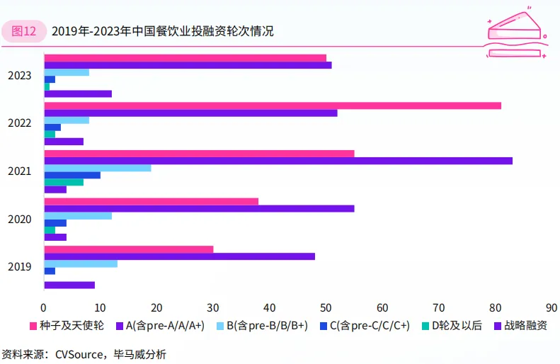 另一方面,成熟期餐饮企业成为投资者的重要布局方向。CVSource数据显示,2019至2023年,共有135家企业获得多轮融资,其中2023年的30家经历过多轮融资的企业近半数为已完成B轮及以上融资的成熟企业。