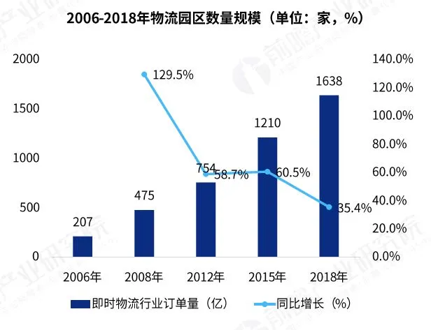 数据显示,目前,我国基本形成了从南到北、从东到西的物流园区建设发展局面,截至2018年,我国包括运营、在建和规划的各类物流园区共计1638家,较2017年增长35.4%;近年来中国物流园区数量增长幅度虽然有所下降,但依旧保持着高速的增长。