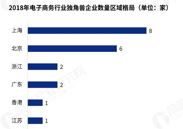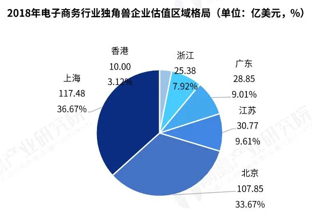 2018年,从企业数量区域分布看,上海的独角兽企业数量最多,达到8家,占据电子商务行业独角兽的四成,北京有6家独角兽上榜,浙江、广东、香港和江苏独角兽企业数量分别为2家、2家、1家、1家。从企业估值区域格局看,独角善估值最高的地区也是上海,为117.48亿美元,占整个区域的36.67%;北京的估值位居第二,占整个区域比重的33.67%,估值为107.85亿美元。江苏、广东、浙江和香港估值占比较少,均低于10%。