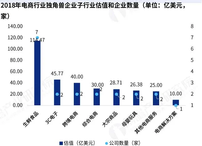 从电子商务的细分行业来看,2018年生鲜食品的估值和独角兽数量最高,合计估值为114.47亿美元,有7家企业。3C电子有2家企业,合计估值位居第二,为45.77亿美元。跨境电商行业估值位居第三,估值为40.00亿美元,有2家企业。综合电商、大宗商品、母婴玩具、其他电商服务、电商解决方案行业独角兽企业估值均在30亿美元及以下,且独角兽企业数量均低于3家。