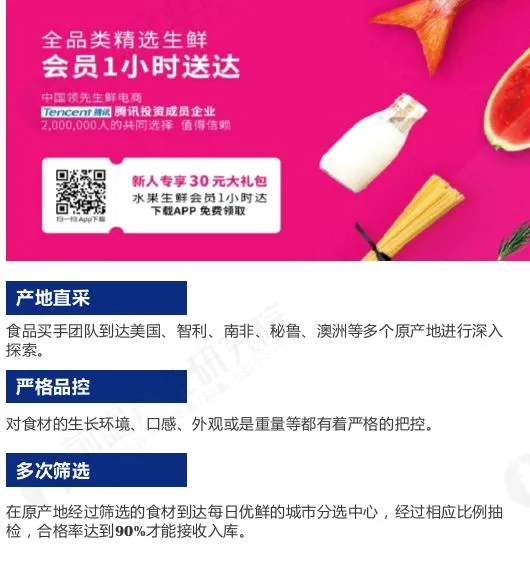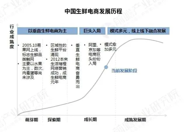 中国生鲜电商市场历经2014-2015年的高速发展,在2016年迎来洗牌期:一方面,一大批中小型生鲜电商企业或倒闭或被并购;另一方面,巨头入局,不断加码冷链物流和生鲜供应链投资,拥有全产业链资源和全渠道资源的企业将愈发具有优势。目前,我国生鲜电商已经处于后成长期,消费者生鲜消费进入品质时代。