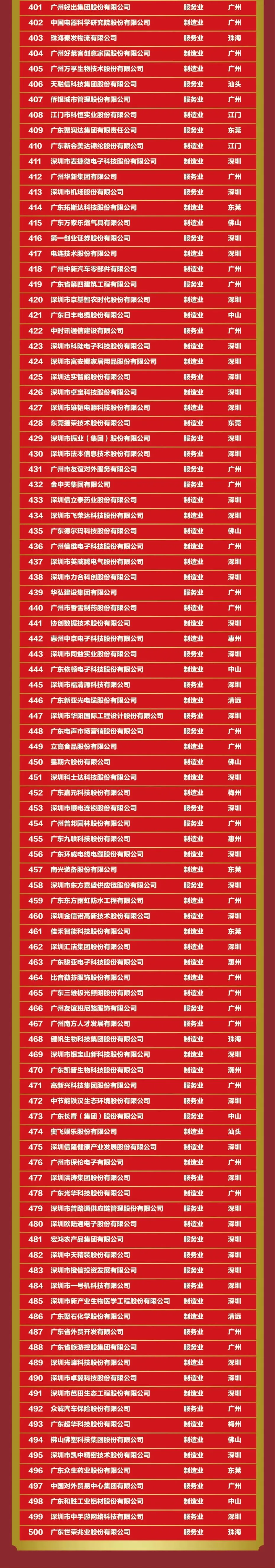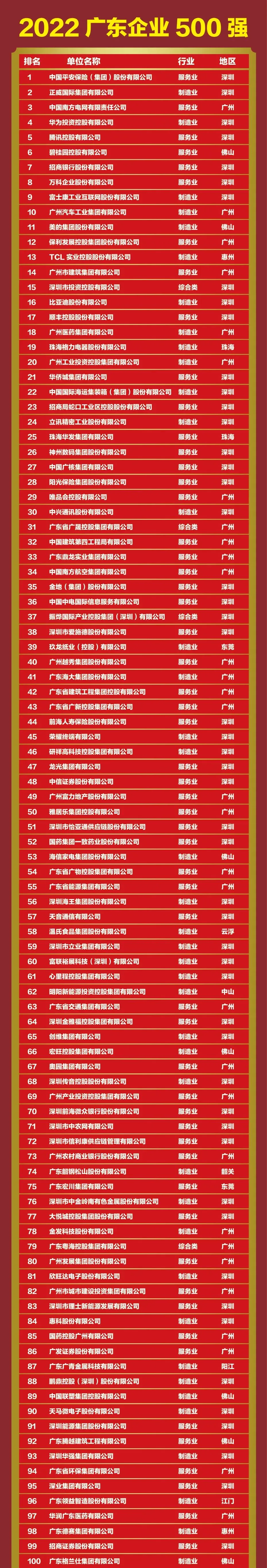 广东省社会科学院党组成员、副院长向晓梅在解读“2022广东企业500强”中提到,与往年相比《2022广东企业500强榜单》有三个显著特点:一、彰显广东企业高质量发展成色。一是进入门槛在提升。2022广东企业500强入围门槛首次突破23亿元,入围门槛呈现持续提升态势。二是总营业收入规模“稳中有增”。2022广东企业500强实现营业收入达到17.01万亿元,企业平均营业收入超过340亿元,与上年500强企业相比净增5.6亿元。三是龙头企业变多变强。2022广东企业500强中,营业收入超过1000亿元的企业有34家,营业收入为10.24万亿元,占2022广东企业500强营业收入总额的60.17%。二、彰显制造业立省底色。一是制造业企业数量处于绝对优势。2022广东企业500强中,制造业企业数量比上年增加23家,占比达到53%。二是制造业企业营业收入处于绝对优势。2022广东企业500强营业收入总额为17.01万亿元;其中265家制造业企业营业收入达7.13万亿元,占广东企业500强营业收入总额的41.92%;三是制造业企业盈利能力显著增强。制造业企业净利润额为4663.60亿元,占广东企业500强净利润总额的34.72%。四是制造业呈现高端化数字化时代化发展趋势。华为、广州工控、美的集团、格力电器、TCL科技、广汽集团、比亚迪等广东制造业在通信设备和信息技术、生物医药、高端制造等领域已经具备较强的竞争优势。三、彰显龙头型引领特色。一是制造业呈现向龙头城市集聚趋势。广州和深圳不仅是粤港澳大湾区的中心城市,也是广东省经济增长两大核心引擎和龙头城市。二是民营企业中头部企业优势明显。1-10强企业总营业收入占比达到55.37%,远高于其余梯队。三是服务业中头部企业资产总额占比超过六成。2022广东服务业企业100强年排名1-10的头部企业营业收入总额高达47523亿元,在总营业收入中占比达到55.56%。