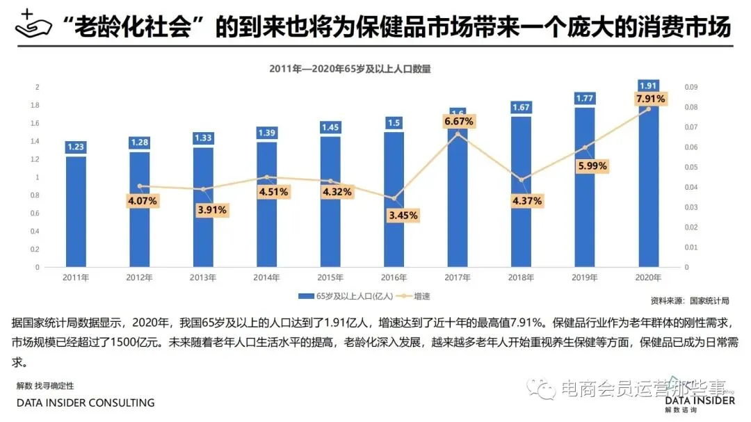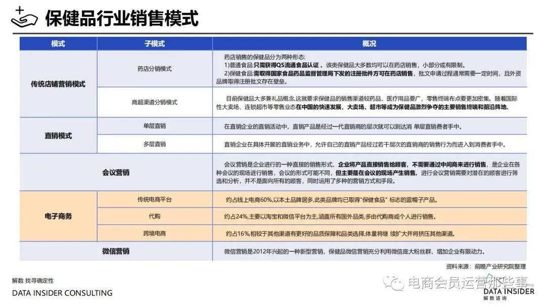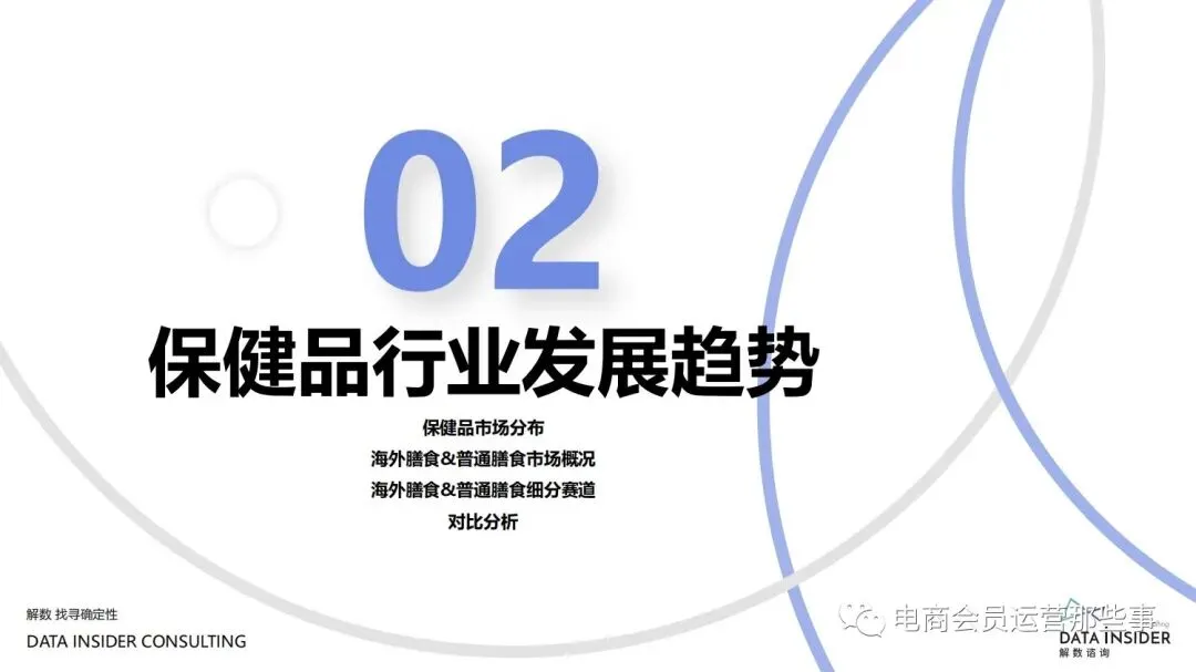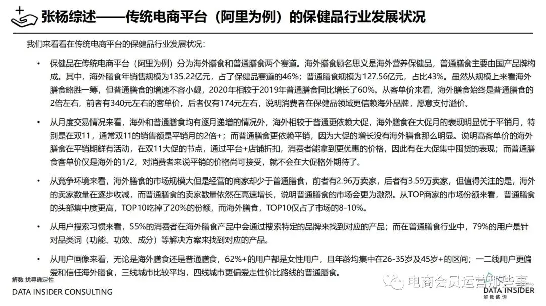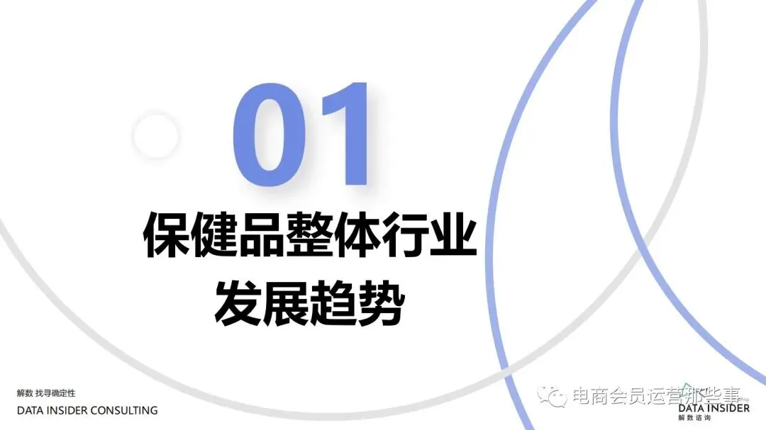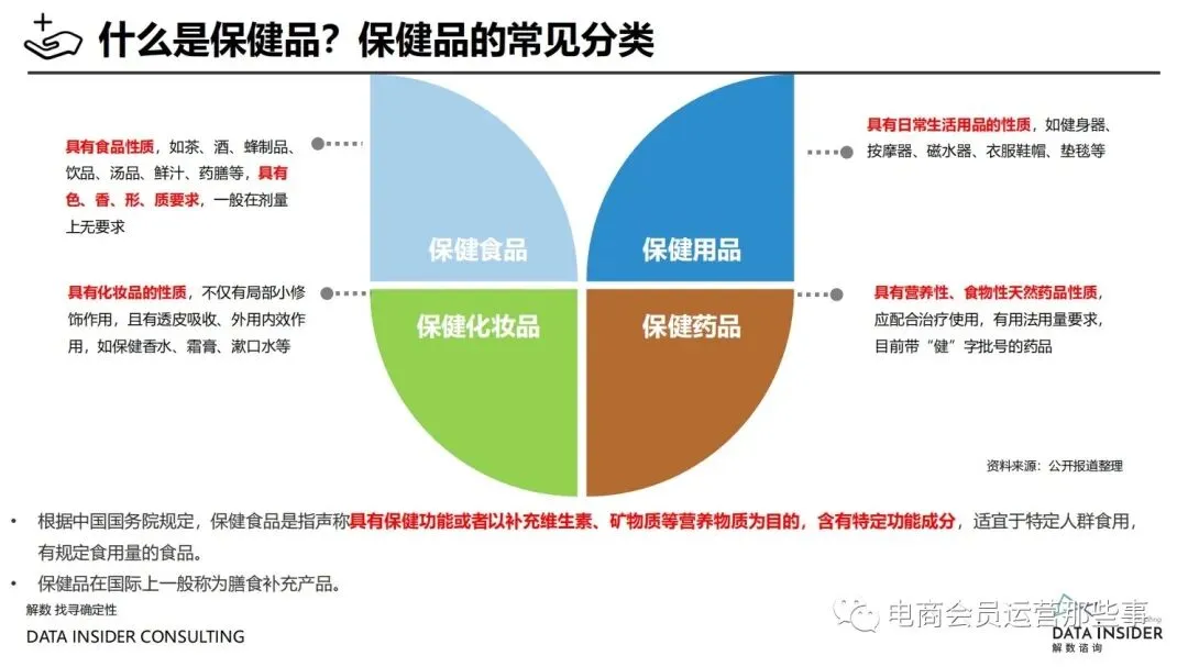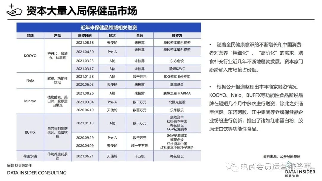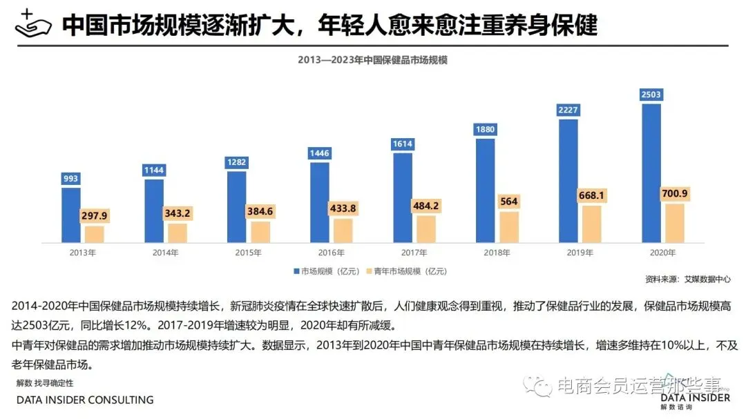 保健品常见有四种分类:保健食品、保健用品、保健化妆品、保健药品。其中,保健食品是指声称具有保健功能或者以补充维生素、矿 物质等营养物质为目的,含有特定功能成分,适宜于特定人群食用,有规定食用量的食品,在国际上一般称为膳食补充产品。• 2020年相较于2013年,保健品市场规模翻了2.5倍(从993亿元增长至2503亿元),值得关注的是青年市场也随之翻了2.35倍(从298 亿元增长至701亿元)。同时,老龄化也成为了社会关注的热点话题,2020年我国65岁及以上的人口达到了1.91亿人,增速达到了近十 年的最高值7.91%。保健品行业作为老年群体的刚性需求,市场规模已经超过了1500亿元。 • 常见的保健品销售渠道及模式有:传统店铺营销、直销、会销、电商、微信营销。我们着重来探讨的就是保健品的电商营销板块。在整 个电商版图中,传统电商平台完成了保健品电商销售60%的份额,且多数品牌均取得健康食品标识的蓝帽子认证;代购占了电商保健品 的24%份额,主要经营海外品牌;跨境电商占保健品16%份额,有海外品牌背书的直营平台。• 随着全民健康意识的不断增长和中国消费者对营养“精细化”、“高阶化”的需求,膳食补充行业近几年不断地蓬勃发展。资本纷纷涌 入市场抢占份额。根据公开报道整理出的2021年保健品融资情况,KOOYO、Nelo、BUFFX等功能性食品新锐品牌在1年内进行多轮融 资,抢占年轻保健品市场;而汤臣倍健、东阿阿胶、江中集团等老牌保健品企业也展开创新,推出了如红枣蛋白粉、胶原蛋白饮等功能 性食品。 -----领取完整报告PDF源文件-----