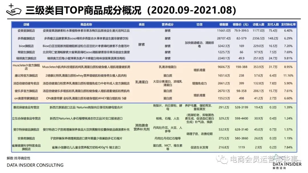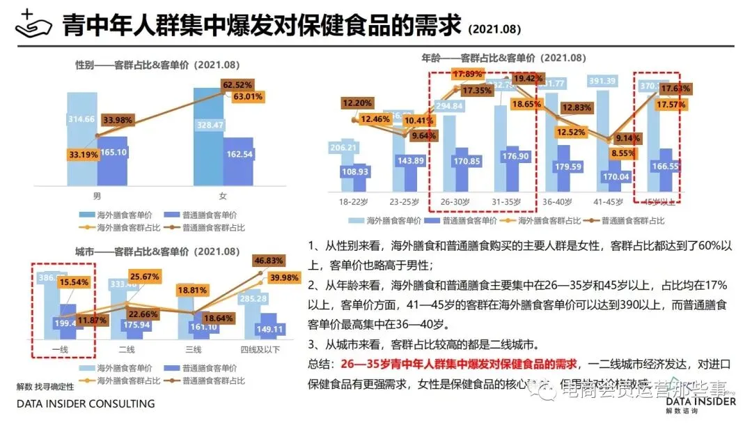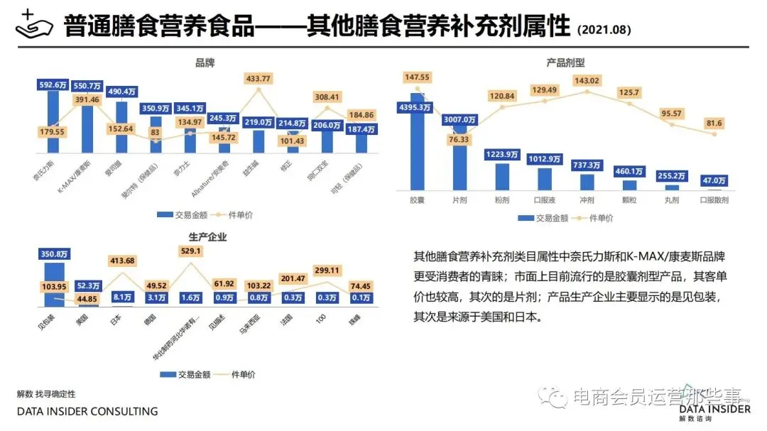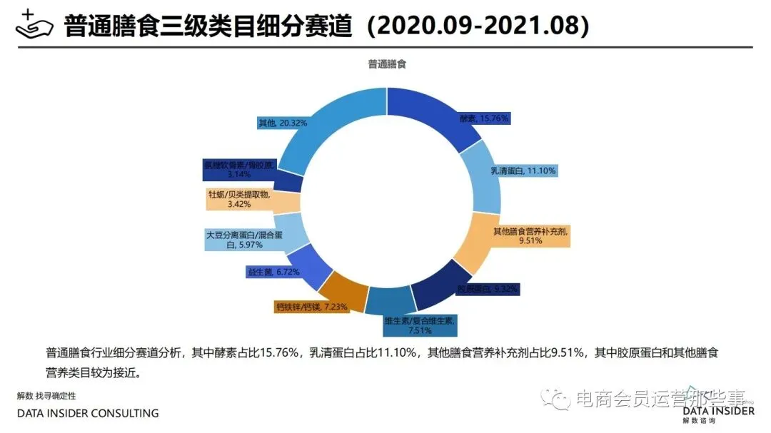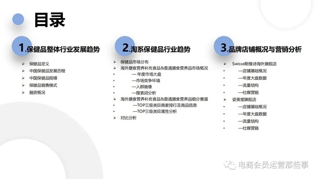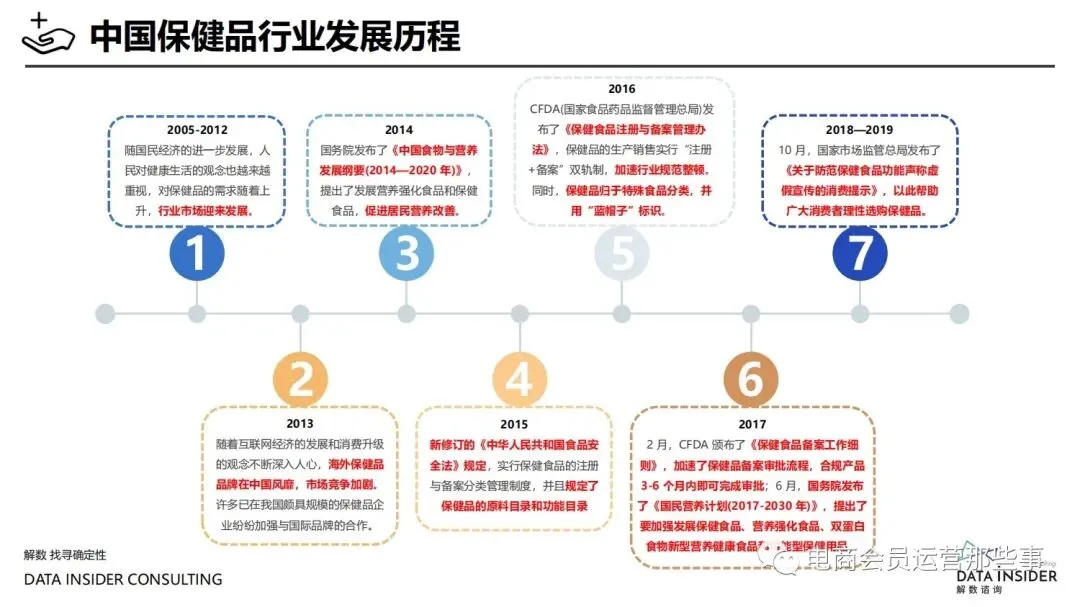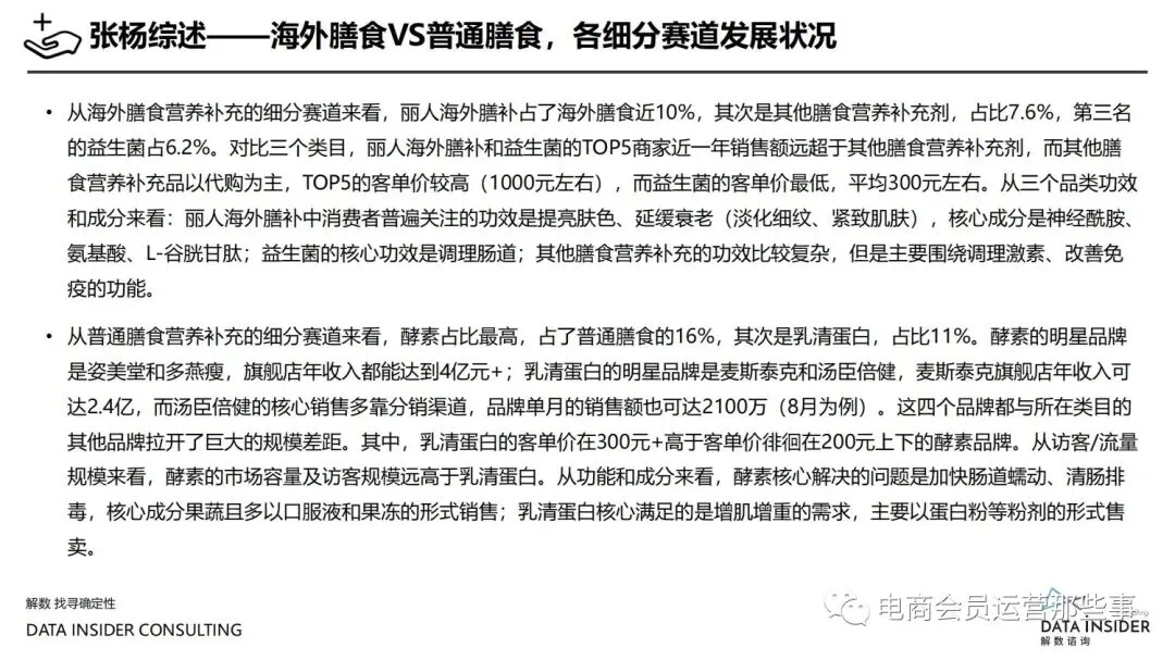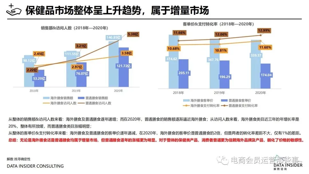 保健品常见有四种分类:保健食品、保健用品、保健化妆品、保健药品。其中,保健食品是指声称具有保健功能或者以补充维生素、矿 物质等营养物质为目的,含有特定功能成分,适宜于特定人群食用,有规定食用量的食品,在国际上一般称为膳食补充产品。• 2020年相较于2013年,保健品市场规模翻了2.5倍(从993亿元增长至2503亿元),值得关注的是青年市场也随之翻了2.35倍(从298 亿元增长至701亿元)。同时,老龄化也成为了社会关注的热点话题,2020年我国65岁及以上的人口达到了1.91亿人,增速达到了近十 年的最高值7.91%。保健品行业作为老年群体的刚性需求,市场规模已经超过了1500亿元。 • 常见的保健品销售渠道及模式有:传统店铺营销、直销、会销、电商、微信营销。我们着重来探讨的就是保健品的电商营销板块。在整 个电商版图中,传统电商平台完成了保健品电商销售60%的份额,且多数品牌均取得健康食品标识的蓝帽子认证;代购占了电商保健品 的24%份额,主要经营海外品牌;跨境电商占保健品16%份额,有海外品牌背书的直营平台。• 随着全民健康意识的不断增长和中国消费者对营养“精细化”、“高阶化”的需求,膳食补充行业近几年不断地蓬勃发展。资本纷纷涌 入市场抢占份额。根据公开报道整理出的2021年保健品融资情况,KOOYO、Nelo、BUFFX等功能性食品新锐品牌在1年内进行多轮融 资,抢占年轻保健品市场;而汤臣倍健、东阿阿胶、江中集团等老牌保健品企业也展开创新,推出了如红枣蛋白粉、胶原蛋白饮等功能 性食品。 -----领取完整报告PDF源文件-----