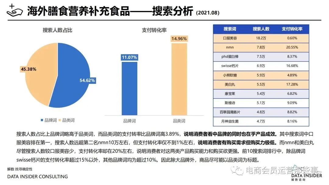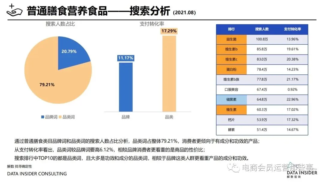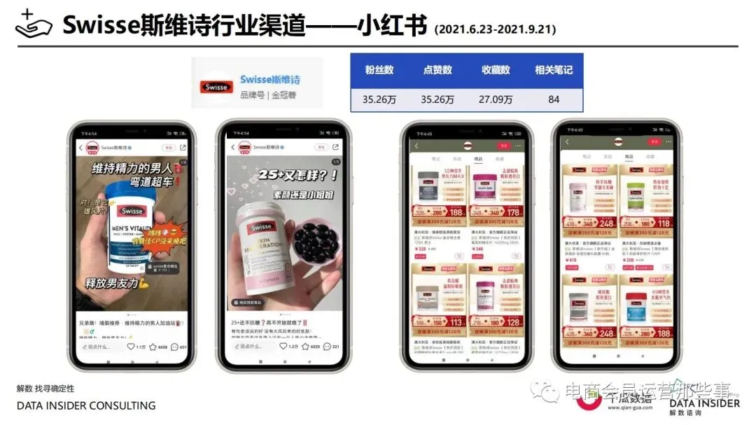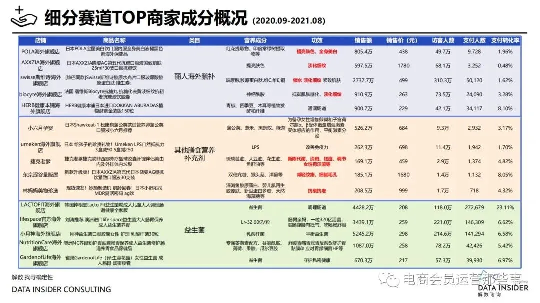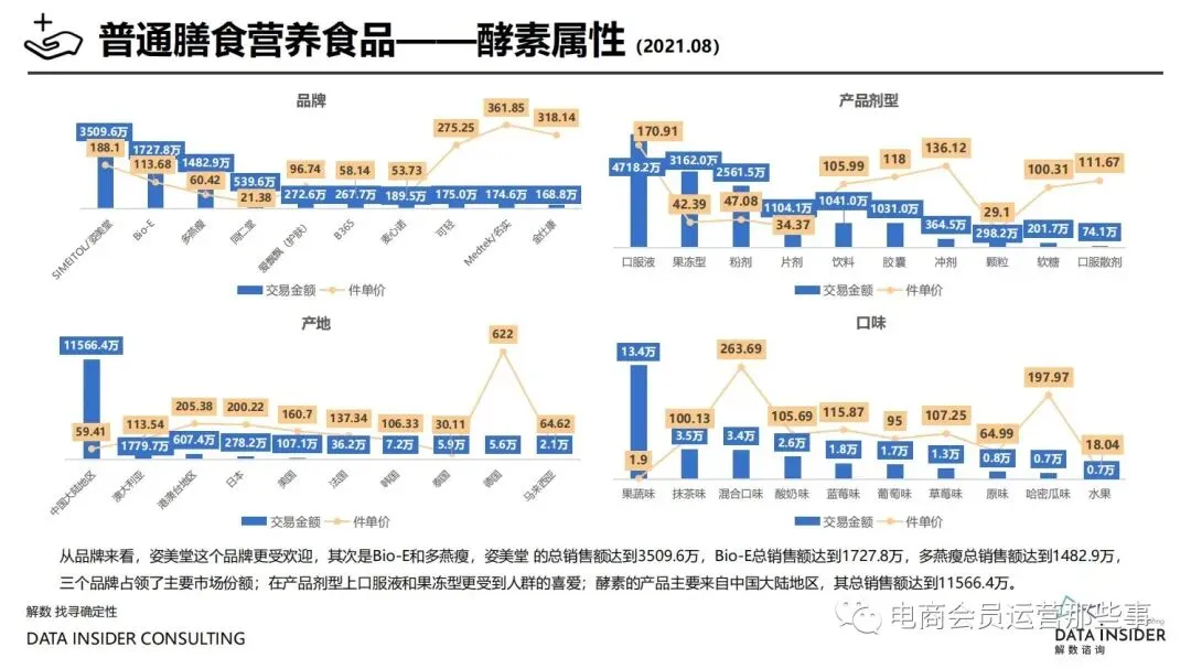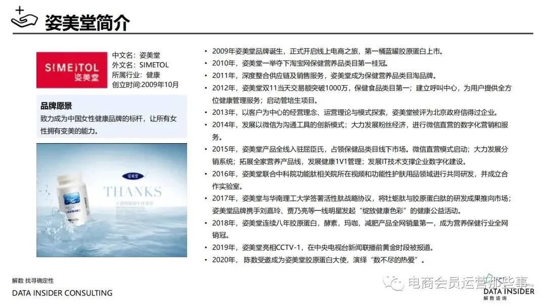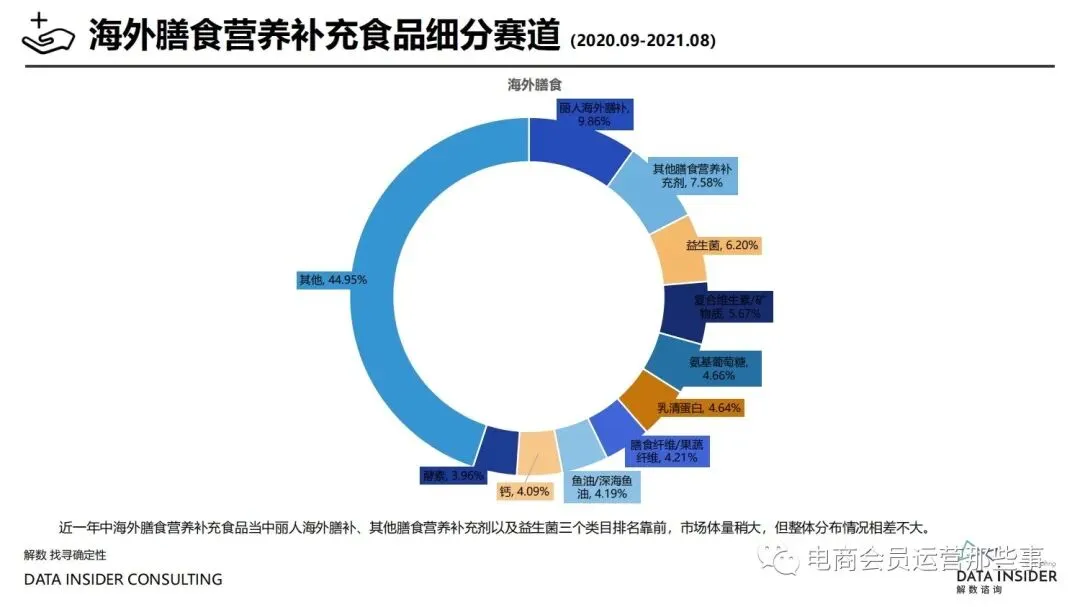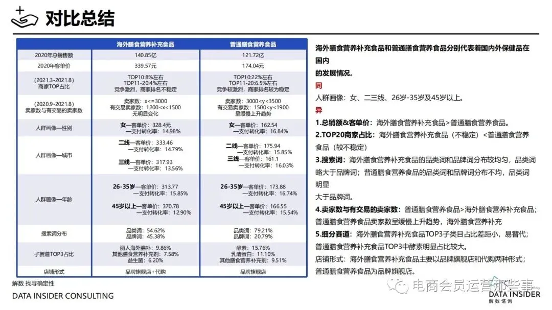 保健品常见有四种分类:保健食品、保健用品、保健化妆品、保健药品。其中,保健食品是指声称具有保健功能或者以补充维生素、矿 物质等营养物质为目的,含有特定功能成分,适宜于特定人群食用,有规定食用量的食品,在国际上一般称为膳食补充产品。• 2020年相较于2013年,保健品市场规模翻了2.5倍(从993亿元增长至2503亿元),值得关注的是青年市场也随之翻了2.35倍(从298 亿元增长至701亿元)。同时,老龄化也成为了社会关注的热点话题,2020年我国65岁及以上的人口达到了1.91亿人,增速达到了近十 年的最高值7.91%。保健品行业作为老年群体的刚性需求,市场规模已经超过了1500亿元。 • 常见的保健品销售渠道及模式有:传统店铺营销、直销、会销、电商、微信营销。我们着重来探讨的就是保健品的电商营销板块。在整 个电商版图中,传统电商平台完成了保健品电商销售60%的份额,且多数品牌均取得健康食品标识的蓝帽子认证;代购占了电商保健品 的24%份额,主要经营海外品牌;跨境电商占保健品16%份额,有海外品牌背书的直营平台。• 随着全民健康意识的不断增长和中国消费者对营养“精细化”、“高阶化”的需求,膳食补充行业近几年不断地蓬勃发展。资本纷纷涌 入市场抢占份额。根据公开报道整理出的2021年保健品融资情况,KOOYO、Nelo、BUFFX等功能性食品新锐品牌在1年内进行多轮融 资,抢占年轻保健品市场;而汤臣倍健、东阿阿胶、江中集团等老牌保健品企业也展开创新,推出了如红枣蛋白粉、胶原蛋白饮等功能 性食品。 -----领取完整报告PDF源文件-----