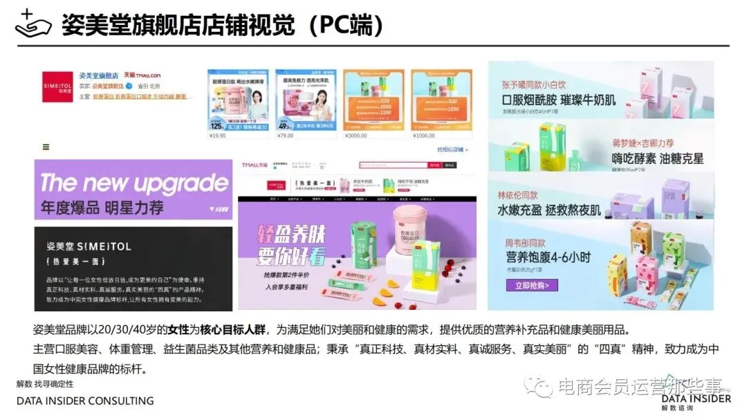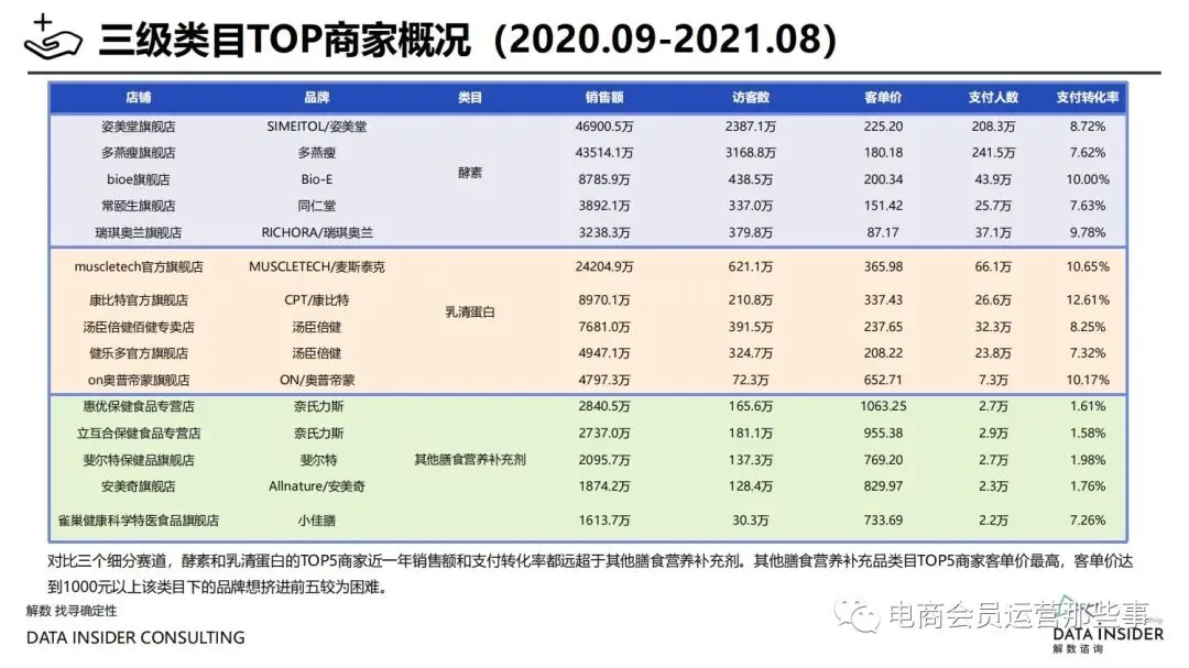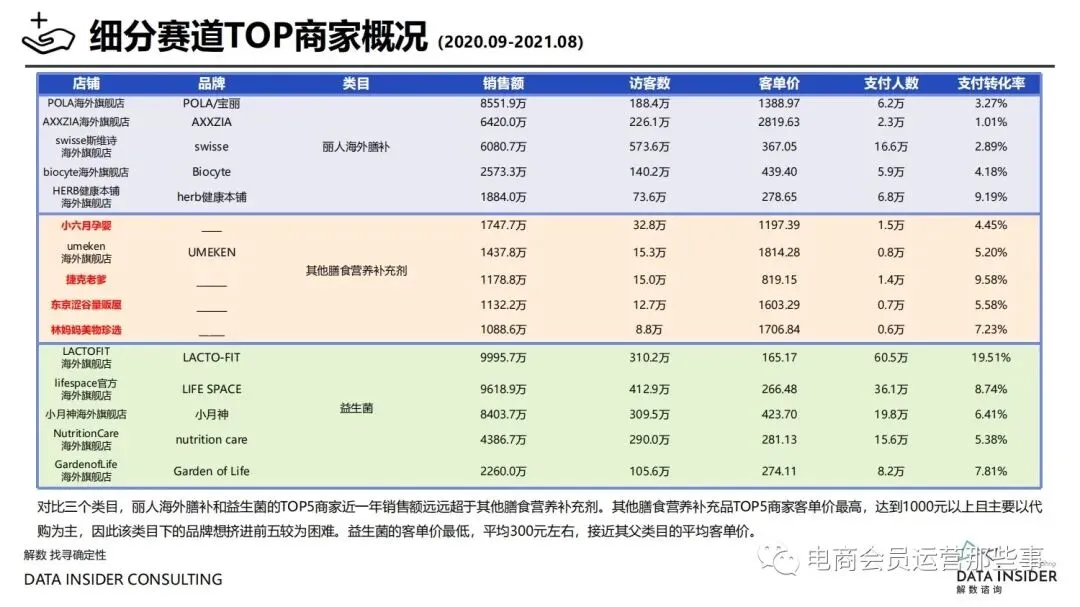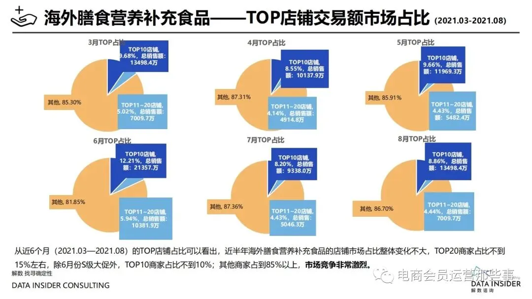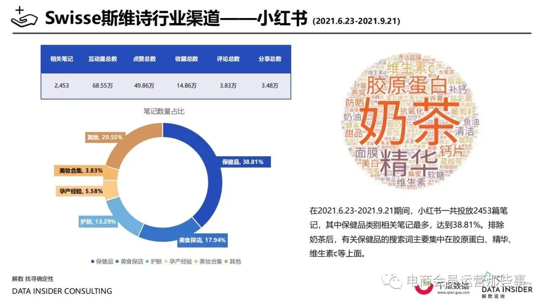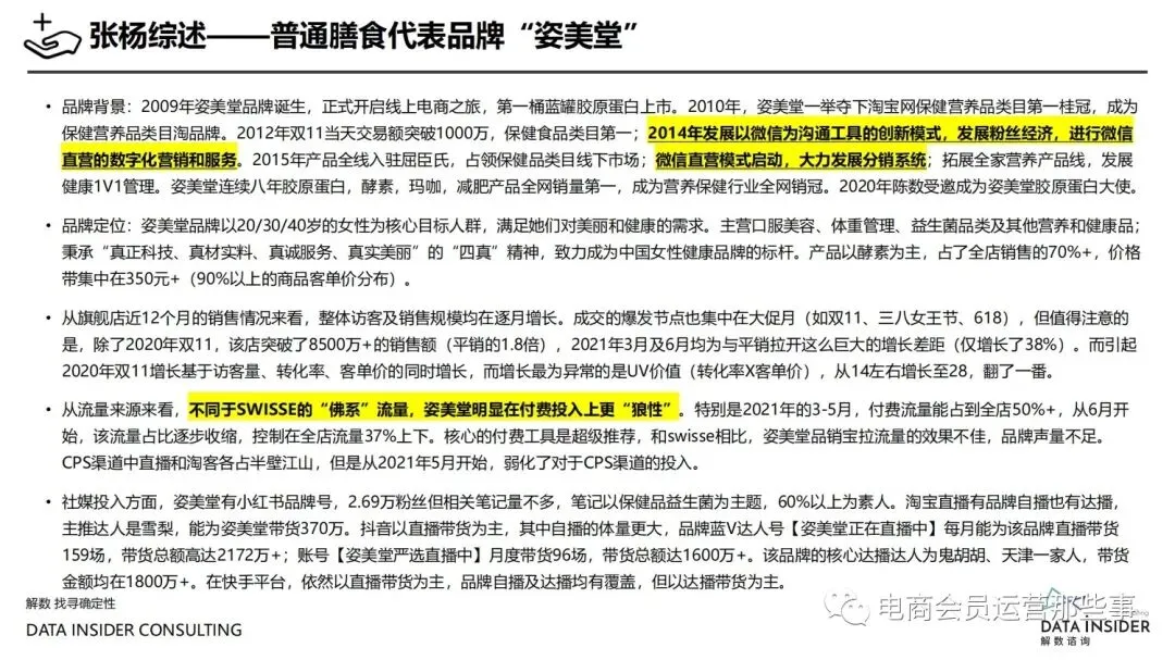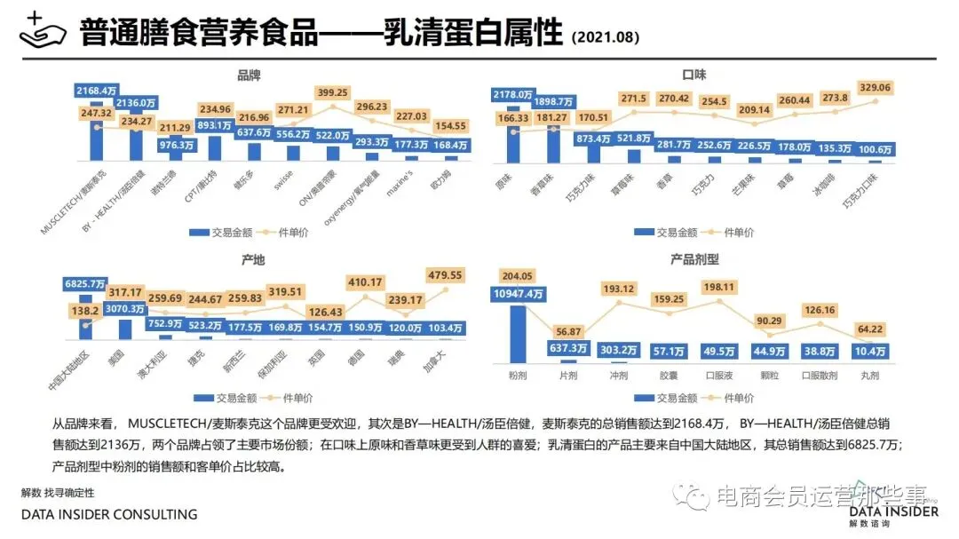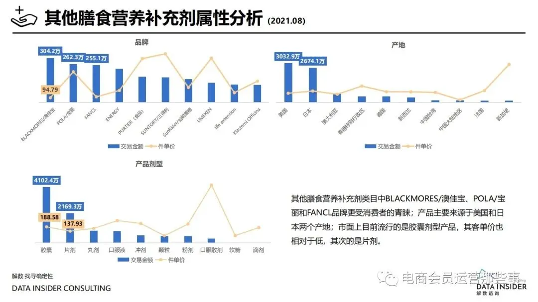 保健品常见有四种分类:保健食品、保健用品、保健化妆品、保健药品。其中,保健食品是指声称具有保健功能或者以补充维生素、矿 物质等营养物质为目的,含有特定功能成分,适宜于特定人群食用,有规定食用量的食品,在国际上一般称为膳食补充产品。• 2020年相较于2013年,保健品市场规模翻了2.5倍(从993亿元增长至2503亿元),值得关注的是青年市场也随之翻了2.35倍(从298 亿元增长至701亿元)。同时,老龄化也成为了社会关注的热点话题,2020年我国65岁及以上的人口达到了1.91亿人,增速达到了近十 年的最高值7.91%。保健品行业作为老年群体的刚性需求,市场规模已经超过了1500亿元。 • 常见的保健品销售渠道及模式有:传统店铺营销、直销、会销、电商、微信营销。我们着重来探讨的就是保健品的电商营销板块。在整 个电商版图中,传统电商平台完成了保健品电商销售60%的份额,且多数品牌均取得健康食品标识的蓝帽子认证;代购占了电商保健品 的24%份额,主要经营海外品牌;跨境电商占保健品16%份额,有海外品牌背书的直营平台。• 随着全民健康意识的不断增长和中国消费者对营养“精细化”、“高阶化”的需求,膳食补充行业近几年不断地蓬勃发展。资本纷纷涌 入市场抢占份额。根据公开报道整理出的2021年保健品融资情况,KOOYO、Nelo、BUFFX等功能性食品新锐品牌在1年内进行多轮融 资,抢占年轻保健品市场;而汤臣倍健、东阿阿胶、江中集团等老牌保健品企业也展开创新,推出了如红枣蛋白粉、胶原蛋白饮等功能 性食品。 -----领取完整报告PDF源文件-----