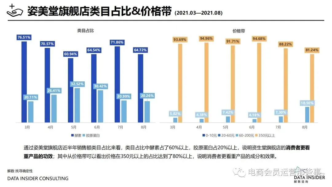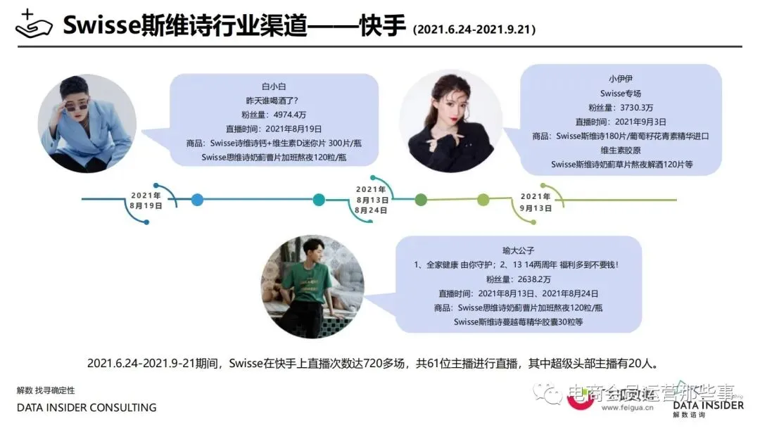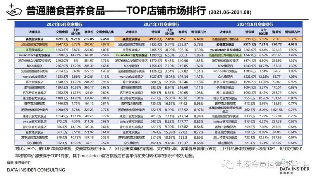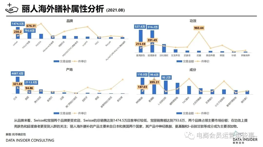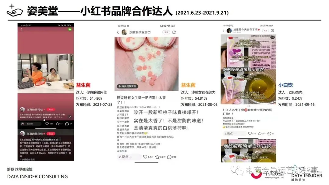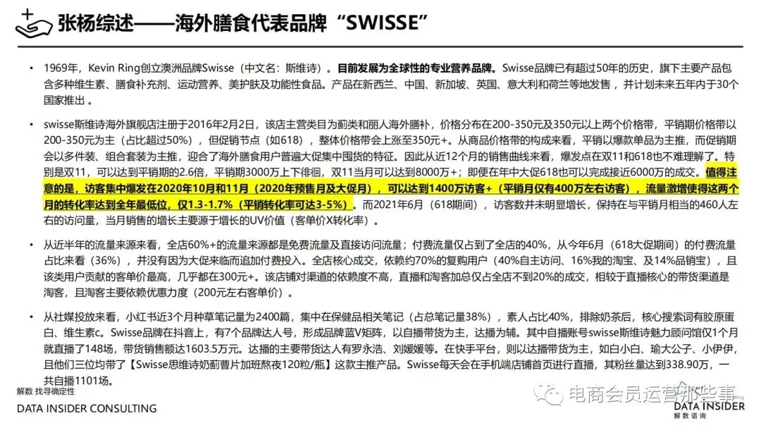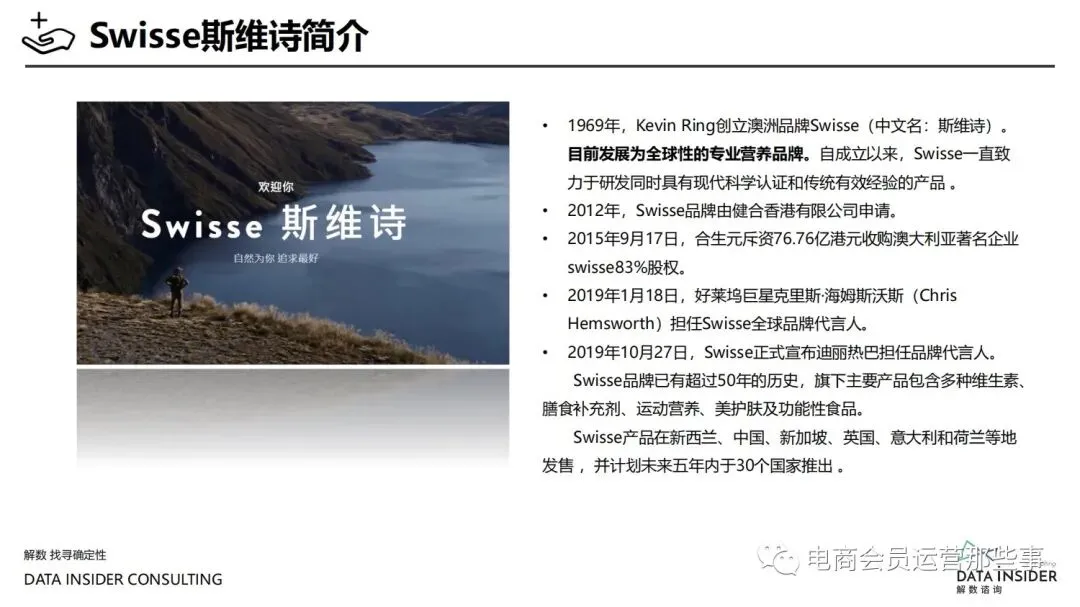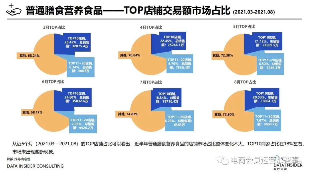保健品常见有四种分类:保健食品、保健用品、保健化妆品、保健药品。其中,保健食品是指声称具有保健功能或者以补充维生素、矿 物质等营养物质为目的,含有特定功能成分,适宜于特定人群食用,有规定食用量的食品,在国际上一般称为膳食补充产品。• 2020年相较于2013年,保健品市场规模翻了2.5倍(从993亿元增长至2503亿元),值得关注的是青年市场也随之翻了2.35倍(从298 亿元增长至701亿元)。同时,老龄化也成为了社会关注的热点话题,2020年我国65岁及以上的人口达到了1.91亿人,增速达到了近十 年的最高值7.91%。保健品行业作为老年群体的刚性需求,市场规模已经超过了1500亿元。 • 常见的保健品销售渠道及模式有:传统店铺营销、直销、会销、电商、微信营销。我们着重来探讨的就是保健品的电商营销板块。在整 个电商版图中,传统电商平台完成了保健品电商销售60%的份额,且多数品牌均取得健康食品标识的蓝帽子认证;代购占了电商保健品 的24%份额,主要经营海外品牌;跨境电商占保健品16%份额,有海外品牌背书的直营平台。• 随着全民健康意识的不断增长和中国消费者对营养“精细化”、“高阶化”的需求,膳食补充行业近几年不断地蓬勃发展。资本纷纷涌 入市场抢占份额。根据公开报道整理出的2021年保健品融资情况,KOOYO、Nelo、BUFFX等功能性食品新锐品牌在1年内进行多轮融 资,抢占年轻保健品市场;而汤臣倍健、东阿阿胶、江中集团等老牌保健品企业也展开创新,推出了如红枣蛋白粉、胶原蛋白饮等功能 性食品。 -----领取完整报告PDF源文件-----
