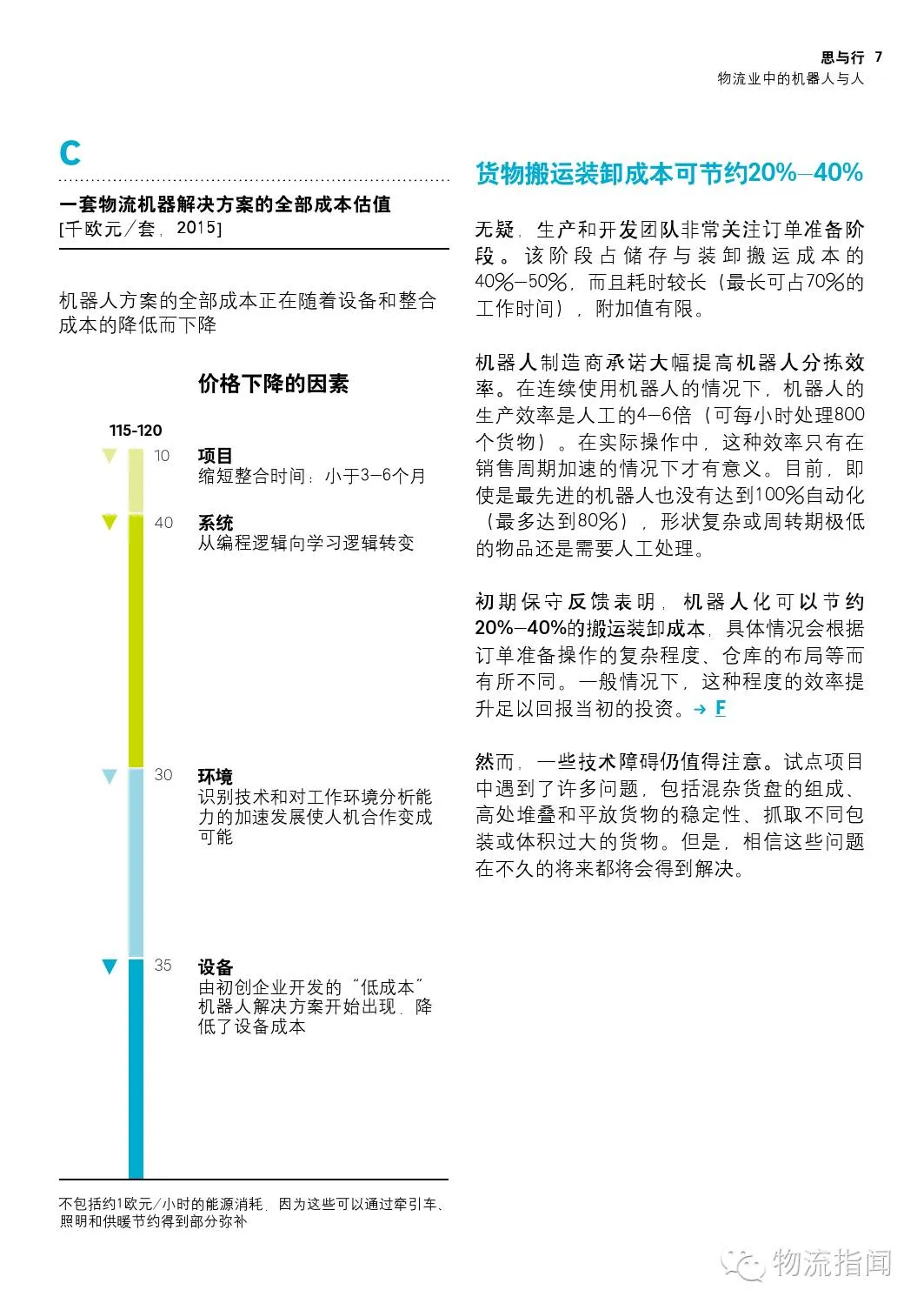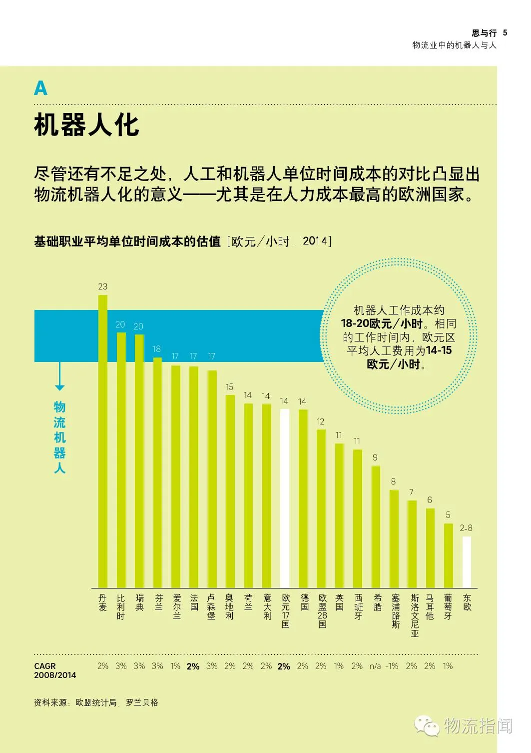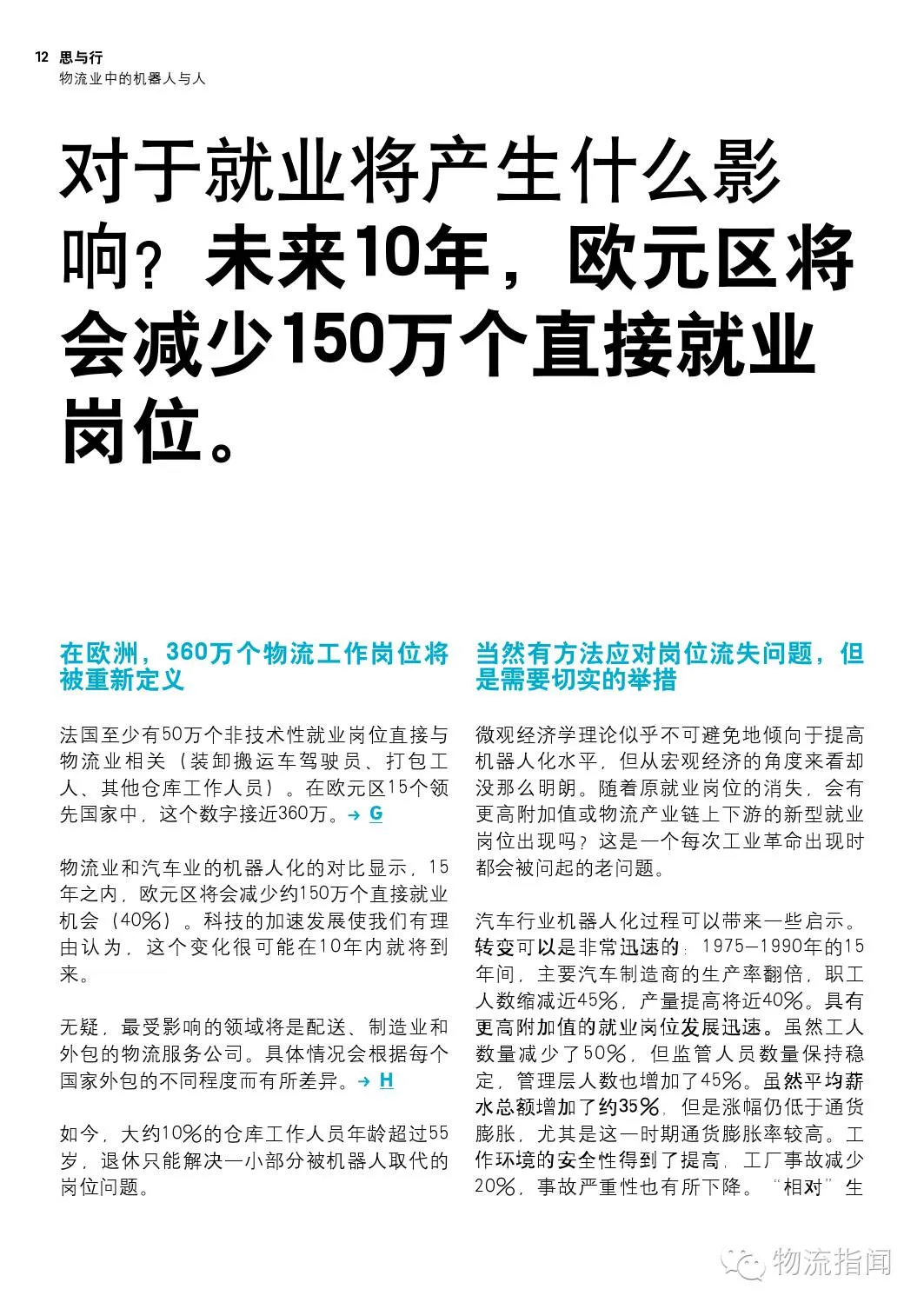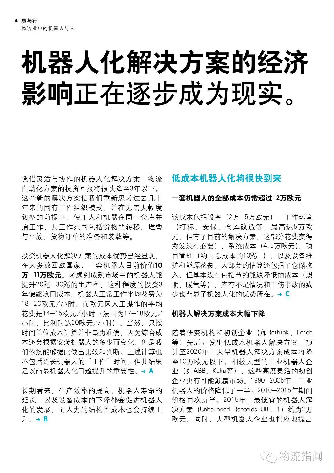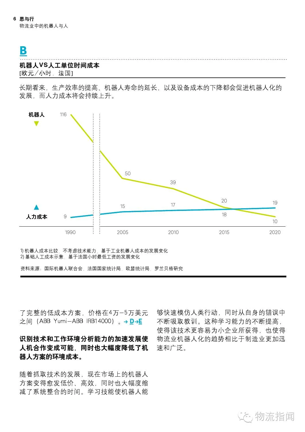 罗兰贝格近日发布报告《物流业中的机器人与人》,分析了物流业大量引进机器人所带来的影响,物流业如何做好准备并在新形势下提高竞争力。报告指出,机器人生产效率的提高、寿命的延长与成本的下降等因素将会促进机器人在物流业中的使用。若无任何过渡性准备,预计物流机器人将在未来十年内取代欧元区150万个工作岗位。
