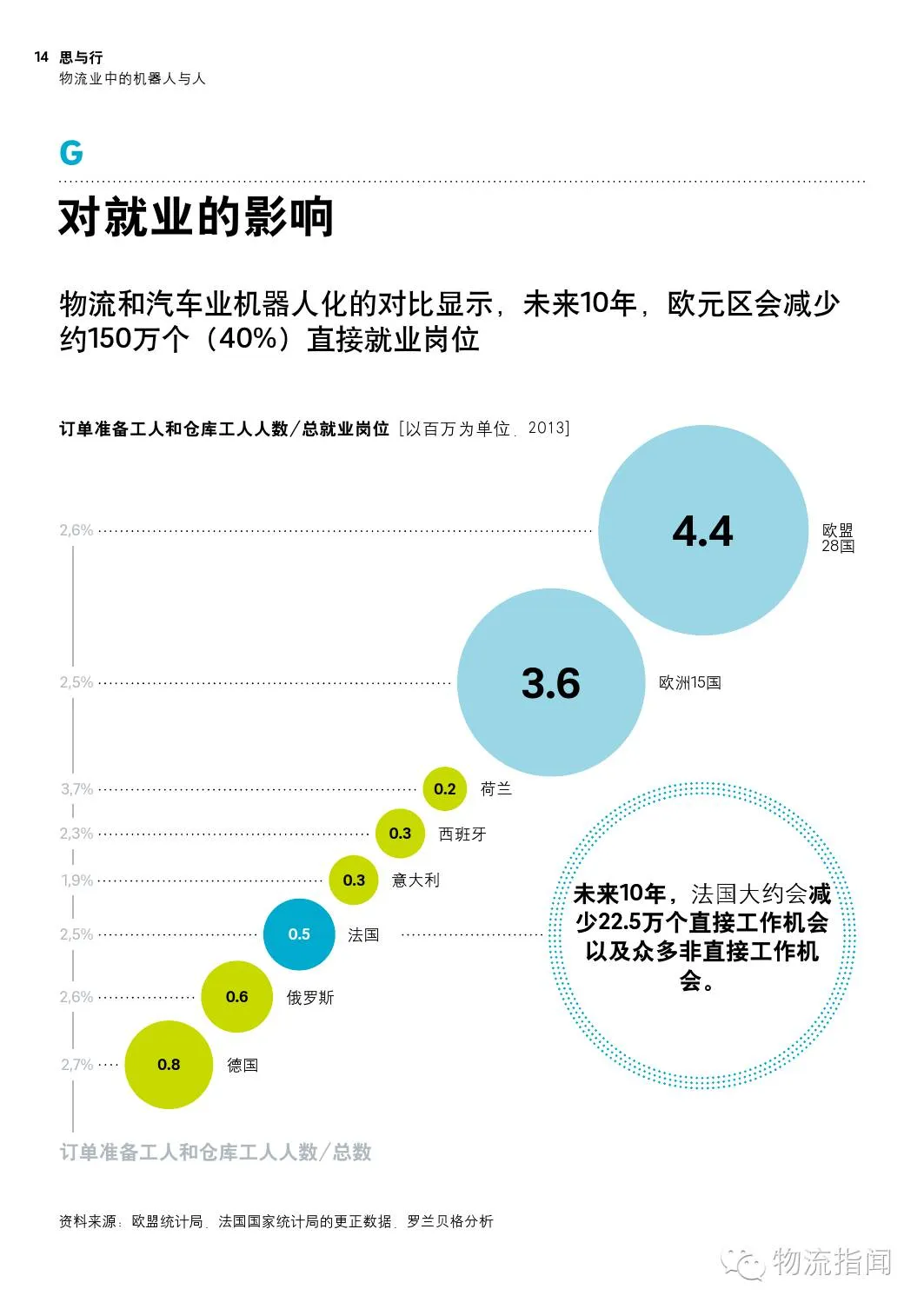 虽然物流业机器人化仍处于起步阶段,但是其巨大潜力使物流业重新思考几十年来的固有工作组织模式。若无任何过渡性准备,未来十年,将机器人应用于物流业将直接导致成千上万的非技术性工作岗位消失,欧元区将消失150万个工作岗位,其中最受影响的领域将是配送、制造业和外包的物流服务公司。考虑到物流本质上无法通过出口及提高服务质量来弥补就业岗位的流失,各国最好通过机器人化来提升物流国际竞争力。