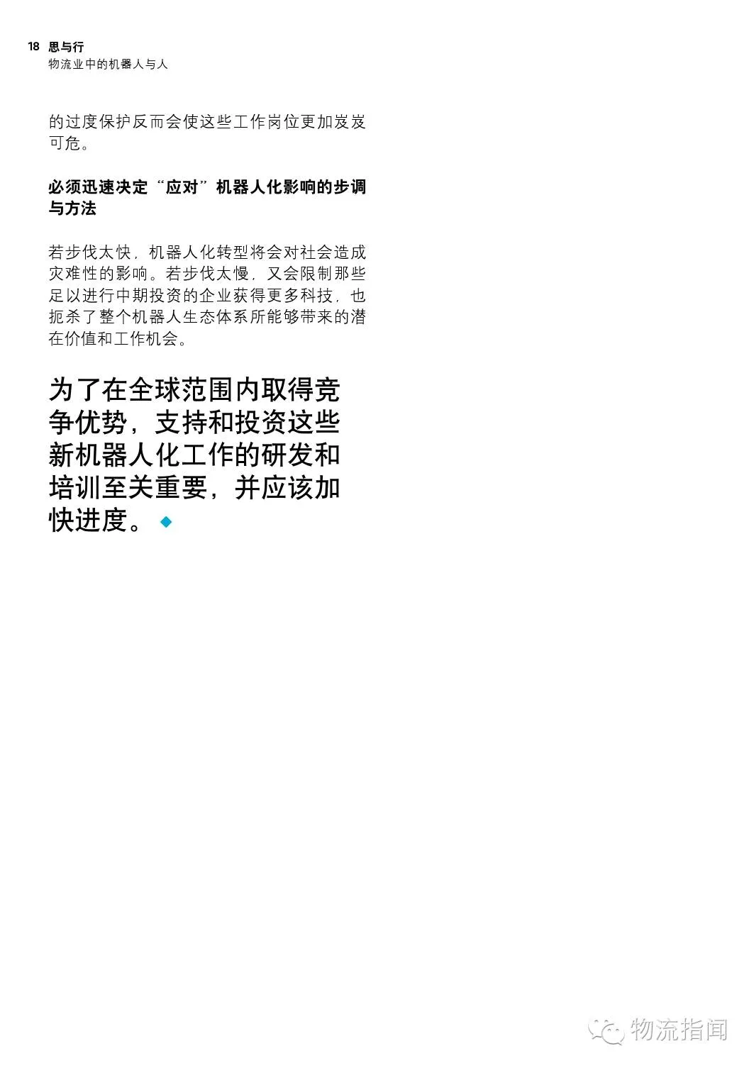 物流业机器人化可能是一个短期的泡沫,但是长期来看将会变成现实。为了在全球范围内取得竞争优势,支持和投资这些新机器人化工作的研发和培训至关重要,并应该加快进度。但若推进步伐太快,机器人化转型将会对社会造成灾难性的影响。若步伐太慢,又会限制那些足以进行中期投资的企业获得更多科技,也扼杀了整个机器人生态体系所能够带来的潜在价值和工作机会。