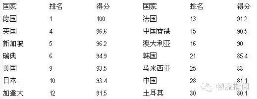 图表2:全球物流业竞争力排名(部分)