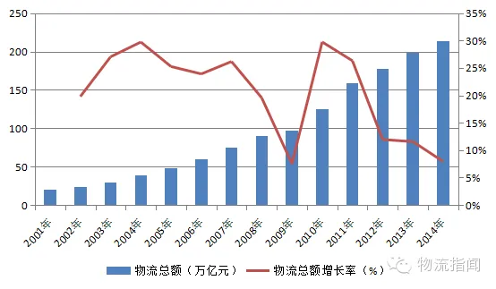 近年来,中国物流行业保持稳中渐升。根据国家统计局的数据,2000年到2014年,全国社会物流总额翻了3.3倍,年复合增长率20%,说明我国在经济快速增长、第三产业迅速发展、城镇化进程进一步推进等背景下,物流业呈现飞速发展的态势。