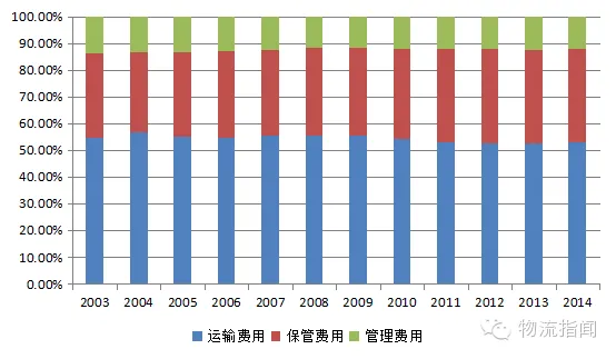 分析中国物流费用结构可以发现,2009年到2014年,运输费在整个物流成本中有下降的趋势,保管费用的占比近年缓慢上涨,管理费用占比基本保持不变。其中运输费用占比最高,主要是由于中国过路过桥费用支出畸高。中国物流保管费用占GDP比重是美国的1.7倍,说明“保管的效率”存在问题,其中主要是资金利用率不高,据《全国物流运行情况通报》披露,利息支出占保管费用40%以上。