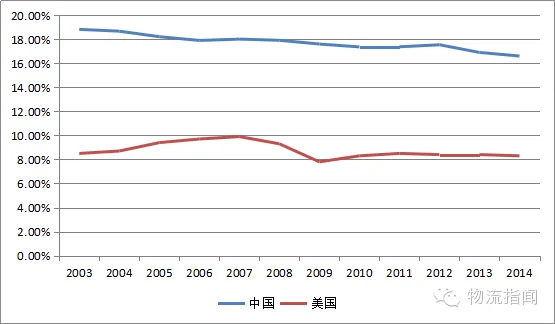 图表5:中国与美国物流总费用占GDP的比重对比